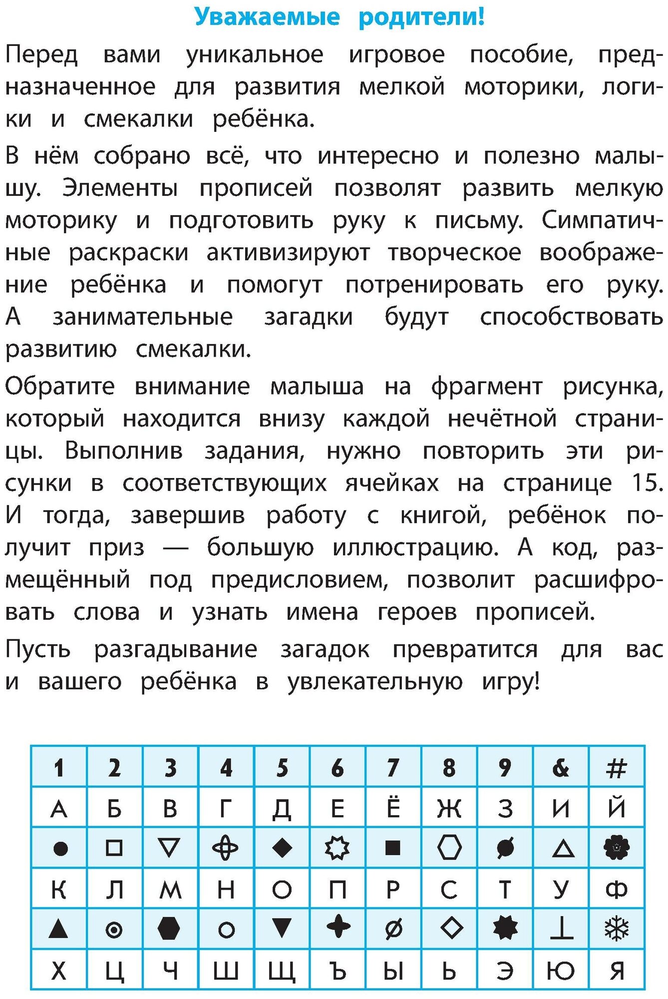 Основная цель пособия - в игровой форме развить мелкую моторику ребёнка и расширить его кругозор. Работать с книгой малыш может как самостоятельно (прописи, раскраски), так и вместе с родителями (выполнение заданий и разгадывание загадок). Задания следует выполнять простым карандашом, а для раскрашивания использовать цветные. Каждая страница включает в себя элементы прописей, развивающие игровые задания, рисунок для раскрашивания, а также элемент сквозного задания, результат которого после выполнения нужно переносить на последнюю страницу в указанную ячейку. В результате у ребёнка получится рисунок домашнего животного. Комплексное пособие предназначено для детей 3-5 лет, их родителей, воспитателей ДОУ с целью развития графических навыков, логики и интеллекта малышей.