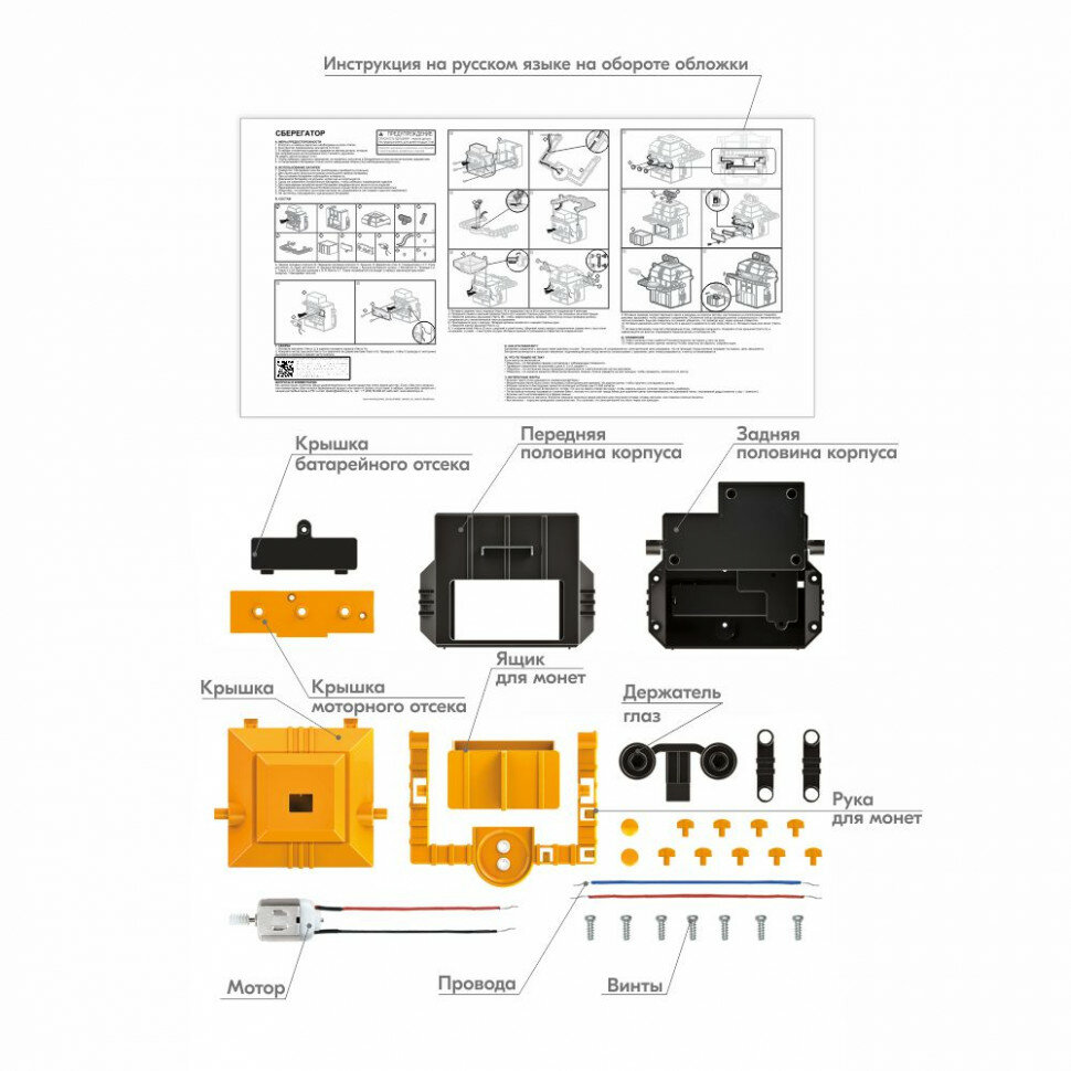 Собери робота-копилку, положи монетку в поднос у него в руках. Робот автоматически спрячет ее. Батарейка соединена с мотором через разъемы на руке. Так как разъемы не соприкасаются, электрическая цепь разорвана, ток не проходит. Когда монетка попадает на поднос, цепь замыкается.