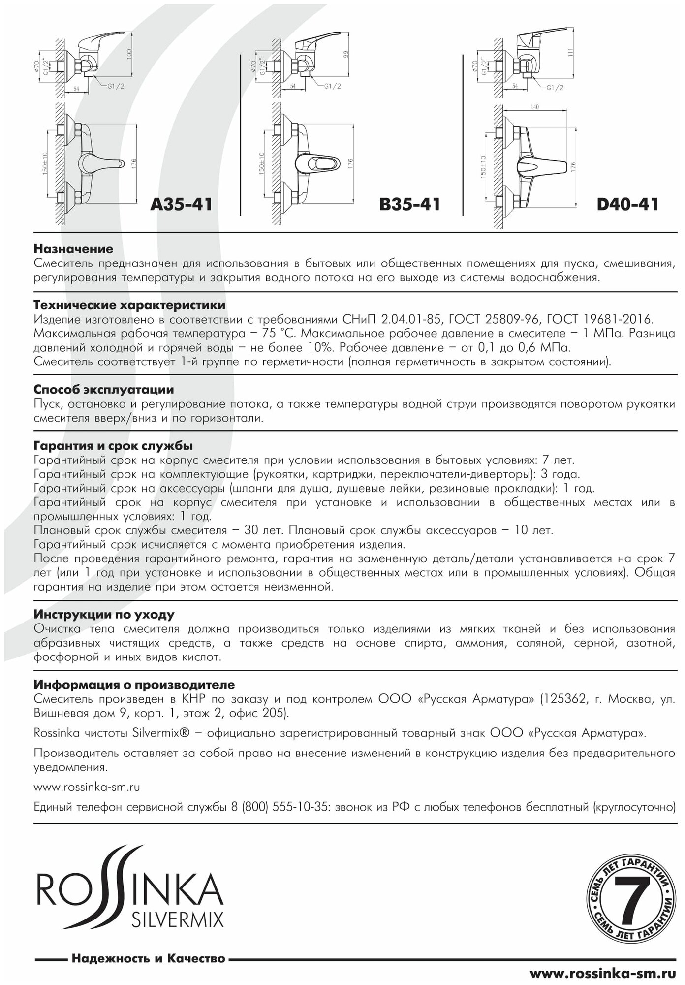 Смесители Rossinka безопасны для потребителя и окружающей среды. Корпус смесителя Rossinka изготавливается методом литья из высококачественной промышленной латуни. Качественные, надежные и доступные смесители Rossinka разработаны ведущими российскими дизайнерами с учетом условий эксплуатации и органично вписываются в стандартное планировочное решение типовых ванных комнат. При низком давлении в системе водопровода в большинстве российских населенных пунктов поток воды замедляется при переключении с лейки на душ и обратно. Решить эту проблему помогают керамические диверторы, установленные в смесителях Rossinka Silvermix. Диверторы устойчивы к гидроудару и обеспечивают ровный, бесперебойный поток воды. Смесители Rossinka Silvermix адаптированы к низкому качеству российской водопроводной воды. Пластиковый аэратор с функцией "Анти-Кальций" препятствует быстрому загрязнению и "выходу из строя" смесителя и аксессуаров.