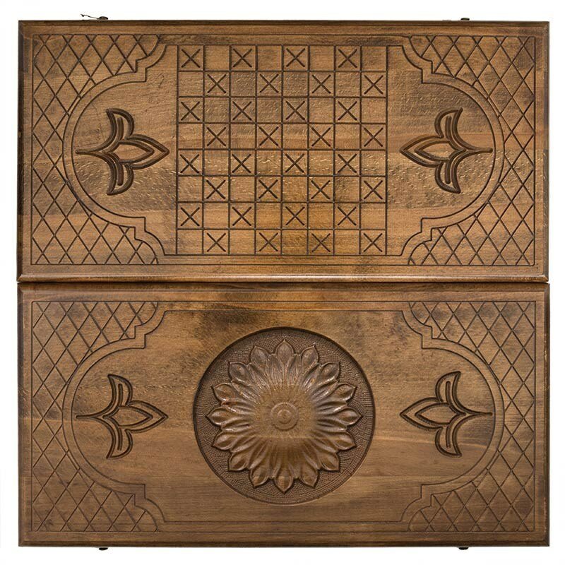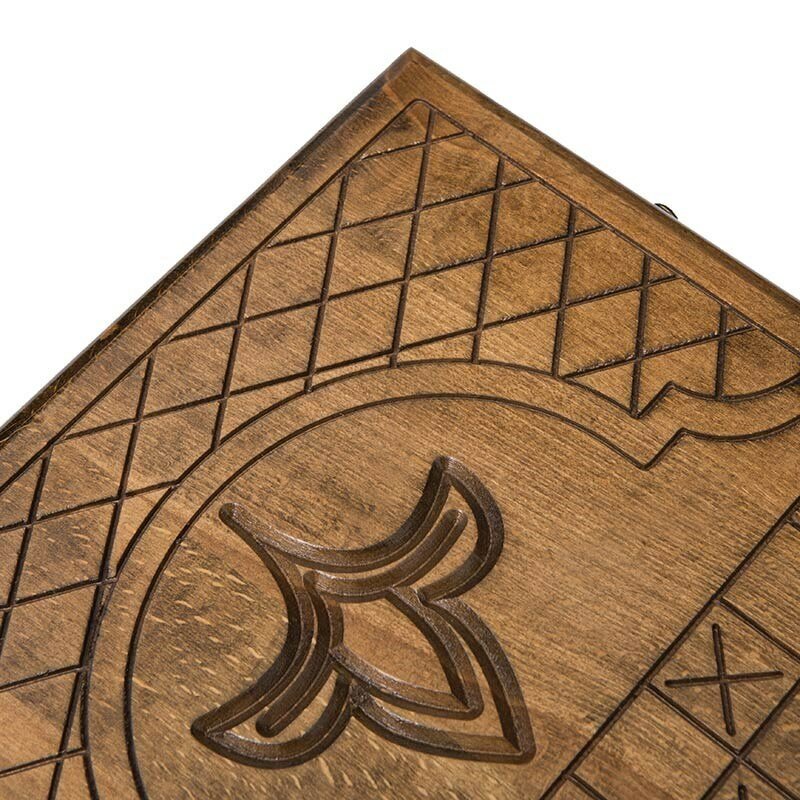 Нарды резные Цветок - неповторимое произведение искусства, достойное стать эксклюзивным украшением любой коллекции настольных игр, изготовленные мастером с мировой известностью, Григорием Устяном. Для изготовления данной доски для игры в нарды, берется цельный массив дерева бук. Он известен своей высокой прочностью, которая спасает от различных сколов, трещин и других повреждений. Кроме того, она обладает поразительной долговечностью и, при правильном и аккуратном использовании, способна прослужить не один десяток лет. Стоит отметить и привлекательную структуру, которая здесь намеренно подчеркивается несколькими слоями лака. Створки соединяются при помощи бронзовых петель, вылитых в необычной форме. Этот металл достаточно мягкий, чтобы не ломаться после сотен и тысяч циклов открытия. Из него же изготавливаются и крючки, которыми закрываются 2 половинки доски. Лицевая сторона верхней части украшена резным изображением цветка. Это полностью ручная работа, выполненная с максимальной скрупулезностью, поэтому и детализация настолько высокая. На обратной стороне имеется поле для игры в шашки, которое позволит расслабиться после напряженных партий в нарды. Внутренняя часть доски размечена под поле для нард. Здесь присутствует вся необходимая для этого разметка. Каждая отдельная ячейка подчеркивается мелкими элементами. Совместно с доской в комплект входит полный набор фишек и пара игральных костей. Также предусмотрен чехол из мягкой ткани, который защитит от пыли и грязи во время длительного хранения.