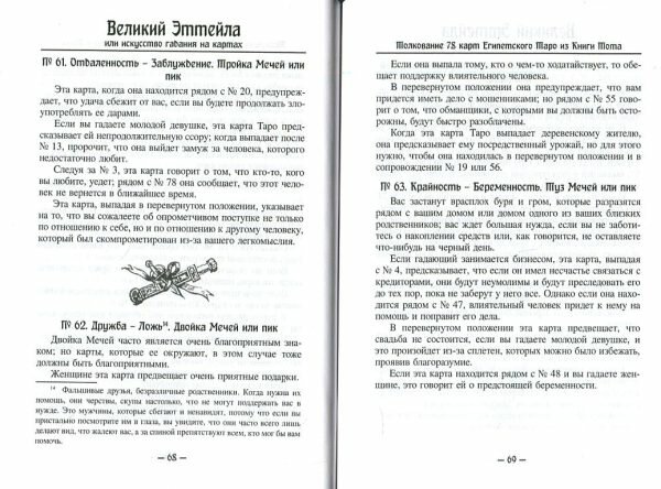 Книга интересна только как исторический памятник , не более того- раскладов очень мало, сама книга тоненькая, больше брошюра компаньон к колоде вот кстати если бы вы ее издали вместе с колодой, которая там приведена, то было бы замечательно, так как такую колоду можно приобрести только на ebay , а то что у вас продается под видом Таро Эттейлы- это вообще не аутентичные колоды Эттейлы, а более поздние разновидности. Часть информации встречается в Иллюстрированном ключе к таро А. Уэйта про значения повторяющихся карт нарпример, по этому ценность информации в книге мала- история Таро так вообще очень сжато. При том что книга стоит почти 500 р. Если вы хотите более серьезный труд по Таро Эттейлы- то из всегда представленного это книга Куманяевой, по крайней мере там изображения хоть и поздней разновидности колоды, но по крайней мере она есть в продаже Грнад Эттейла от Ло скарабео и раскладов в ней куда больше старинных. Брал вместе с этой книгой книгу Бен Дова Марсельское таро, так она толще, в твердой обложке и стоит 300 р. Вообщем цена слишком завышена на эту книгу.