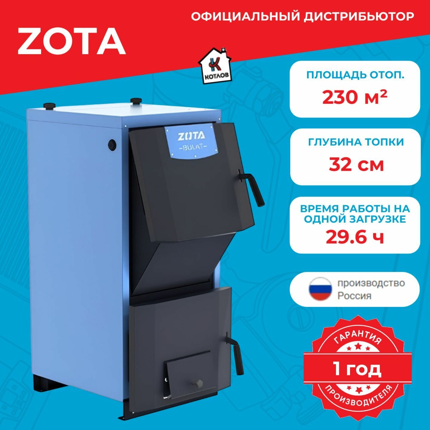 Отечественный производитель отопительного оборудования, компания ZOTA, предлагает Вам модельный ряд твердотопливных котлов «Bulat», главным отличием которых является большой объем топки и, соответственно, длительный цикл горения на одной загрузке топлива. В качестве топлива в данных агрегатах могут использоваться дрова, уголь любых сортов, а также древесные брикеты.
