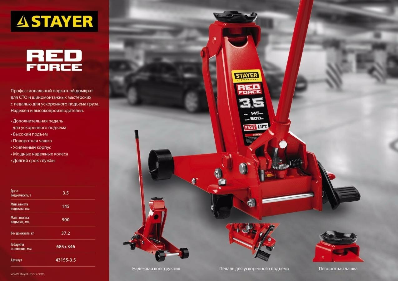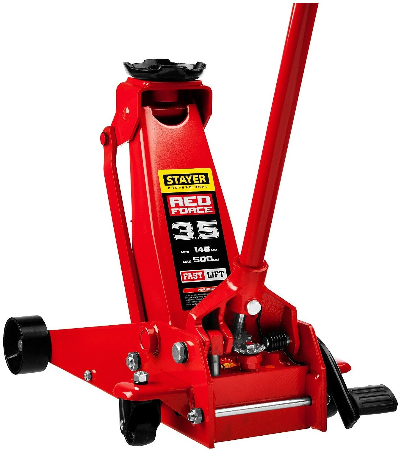 Домкрат STAYER 43155-3.5 гидравлический подкатной red force с педалью 3.5т 145-500мм