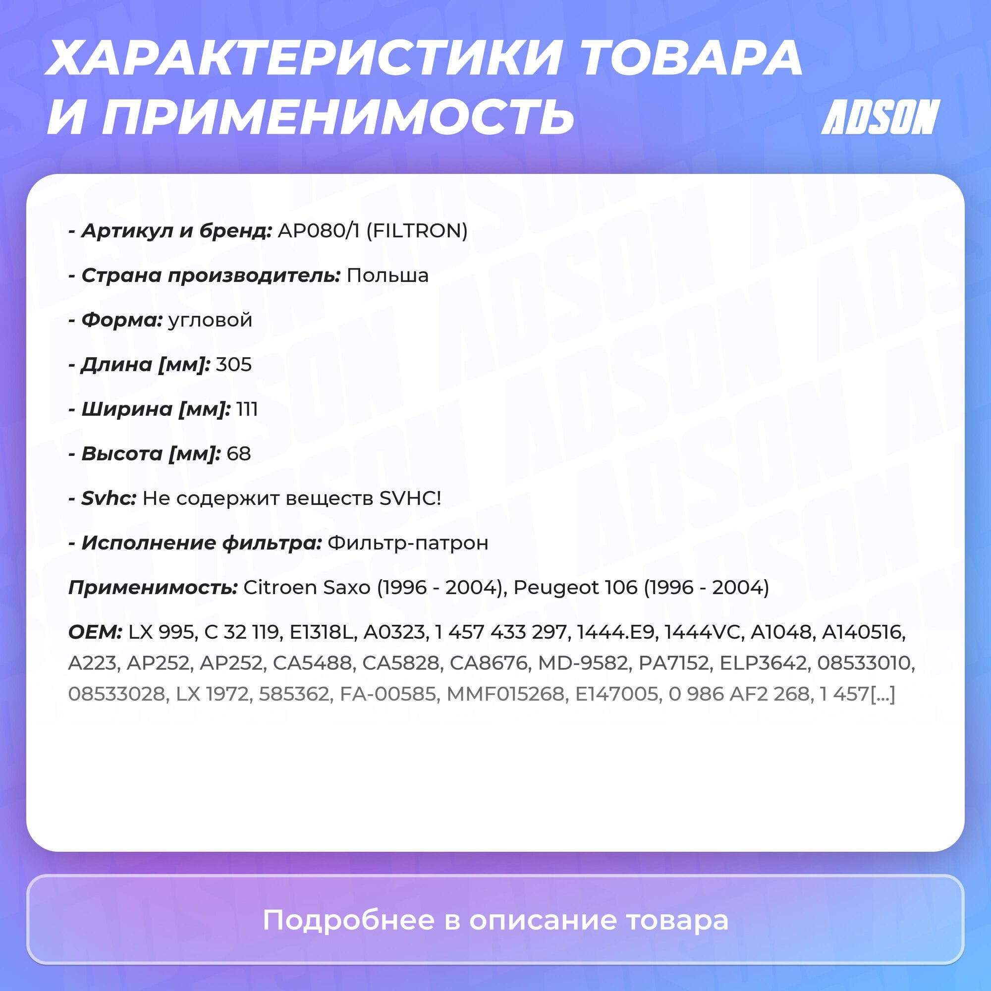 Тип товара: Воздушный фильтр