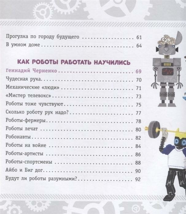Книга рассказывает о самых разных роботах, которые окружают нас сегодня: роботах-рабочих на заводах, роботах-фермерах, собирающих урожай на полях и в садах, космических роботах на орбите, бытовых роботах, выполняющих разнообразную работу по дому, роботах-военных и роботах-артистах и многих-многих других интереснейших и умных машинах. А также об уже вошедших в нашу жизнь умных часах, умных автомобилях и умных домах.