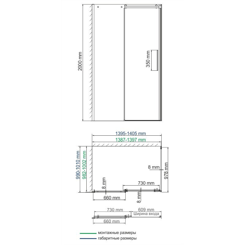 - Диапазон регулировки ширины двери за счет боковых профилей: 1395-1405 мм.