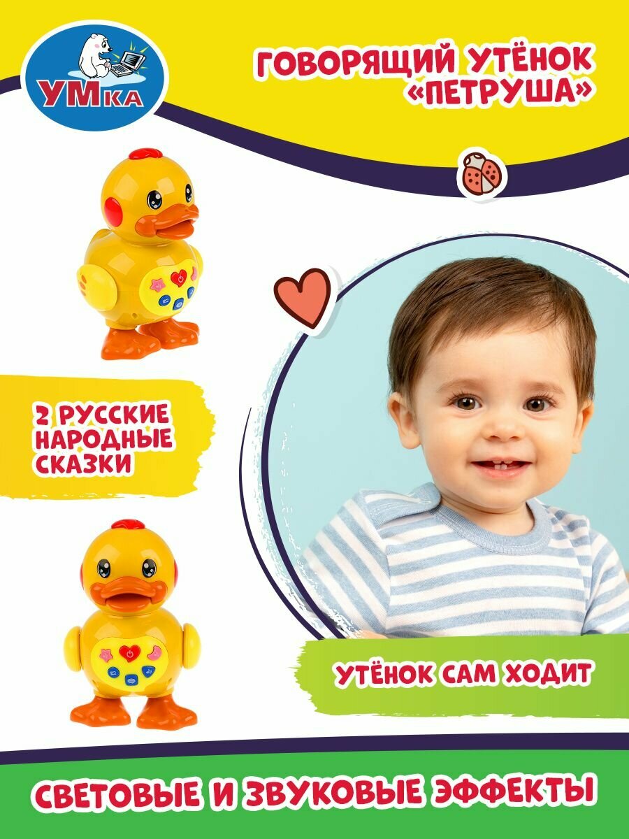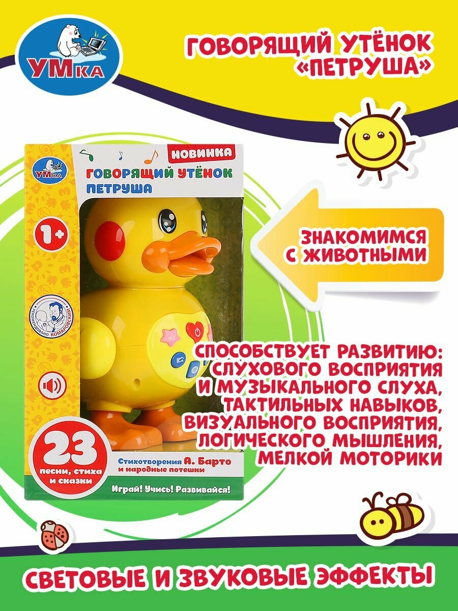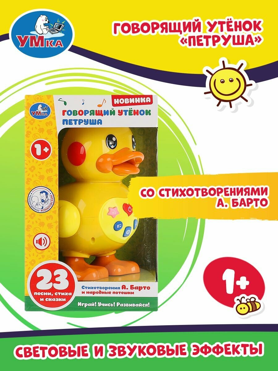 Развивающая игрушка «Говорящий утёнок Петруша» ТМ «УМка».Малышам понравится добрый образ игрушки-утёнка. Игрушка способствует развитию у ребёнка фантазии и воображения, чувства ритма и музыкального слуха. Рекомендована педиатром Комаровским. Игрушка «Говорящий утёнок Петруша» ТМ «УМка» 4 в 1:- Утёнок произносит 19 весёлых фраз;- Сенсорные детали: голова и хвостик;- Умеет двигаться и машет малышам крылышками;- Со звуковыми эффектами: воспроизводит 23 песенки, стиха и сказки.Размеры музыкальной игрушки: 14 * 20 * 13 см.Материал: пластмасса + металл.Работает от 4-х батареек АА (пальчиковые).Рекомендуем для детей от 1-го года.