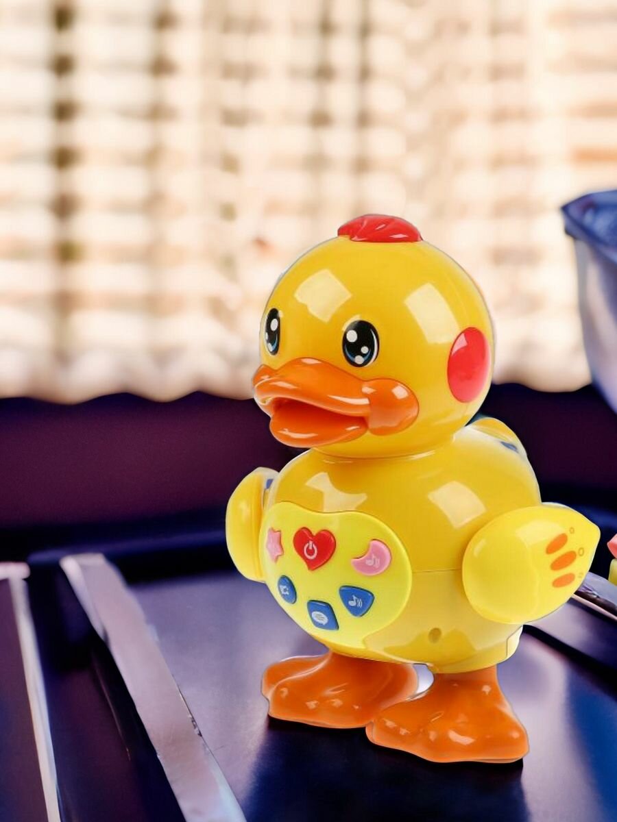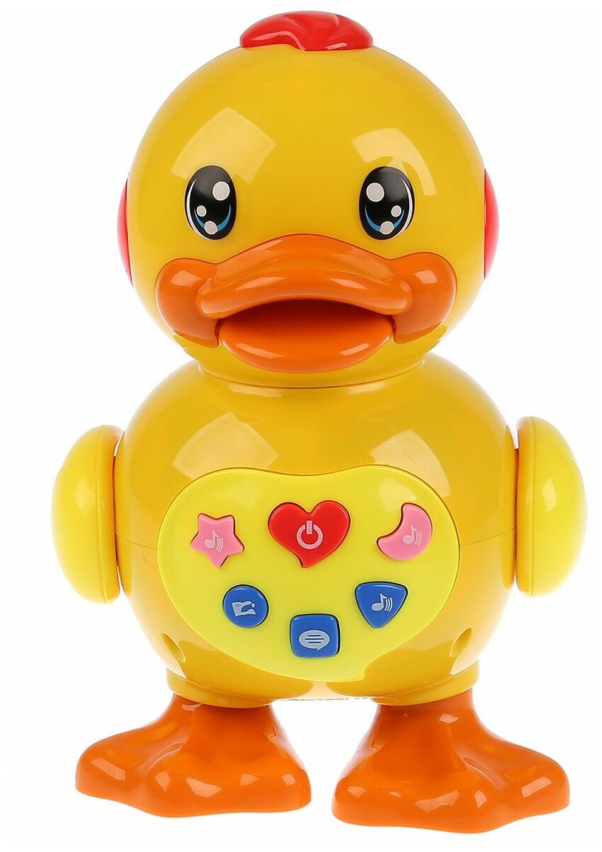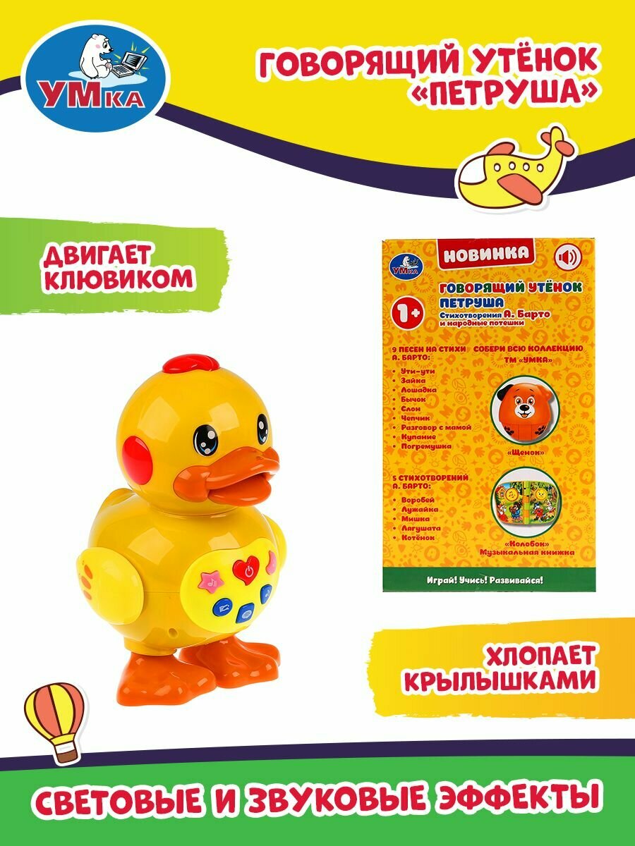 Развивающая игрушка «Говорящий утёнок Петруша» ТМ «УМка».Малышам понравится добрый образ игрушки-утёнка. Игрушка способствует развитию у ребёнка фантазии и воображения, чувства ритма и музыкального слуха. Рекомендована педиатром Комаровским. Игрушка «Говорящий утёнок Петруша» ТМ «УМка» 4 в 1:- Утёнок произносит 19 весёлых фраз;- Сенсорные детали: голова и хвостик;- Умеет двигаться и машет малышам крылышками;- Со звуковыми эффектами: воспроизводит 23 песенки, стиха и сказки.Размеры музыкальной игрушки: 14 * 20 * 13 см.Материал: пластмасса + металл.Работает от 4-х батареек АА (пальчиковые).Рекомендуем для детей от 1-го года.