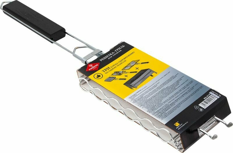 в том числе сосисок, сарделек, купат, колбасок. Решетка-гриль изготовлена из стали с коррозионностойким покрытием, которое обеспечит долгий строк службы решетки, деревянная ручка защищает руку от ожогов. Надежное кольцо-фиксатор гарантирует, что продукты не выпадут. Регулируемая высота решетки позволяет готовить колбаски разной толщины.