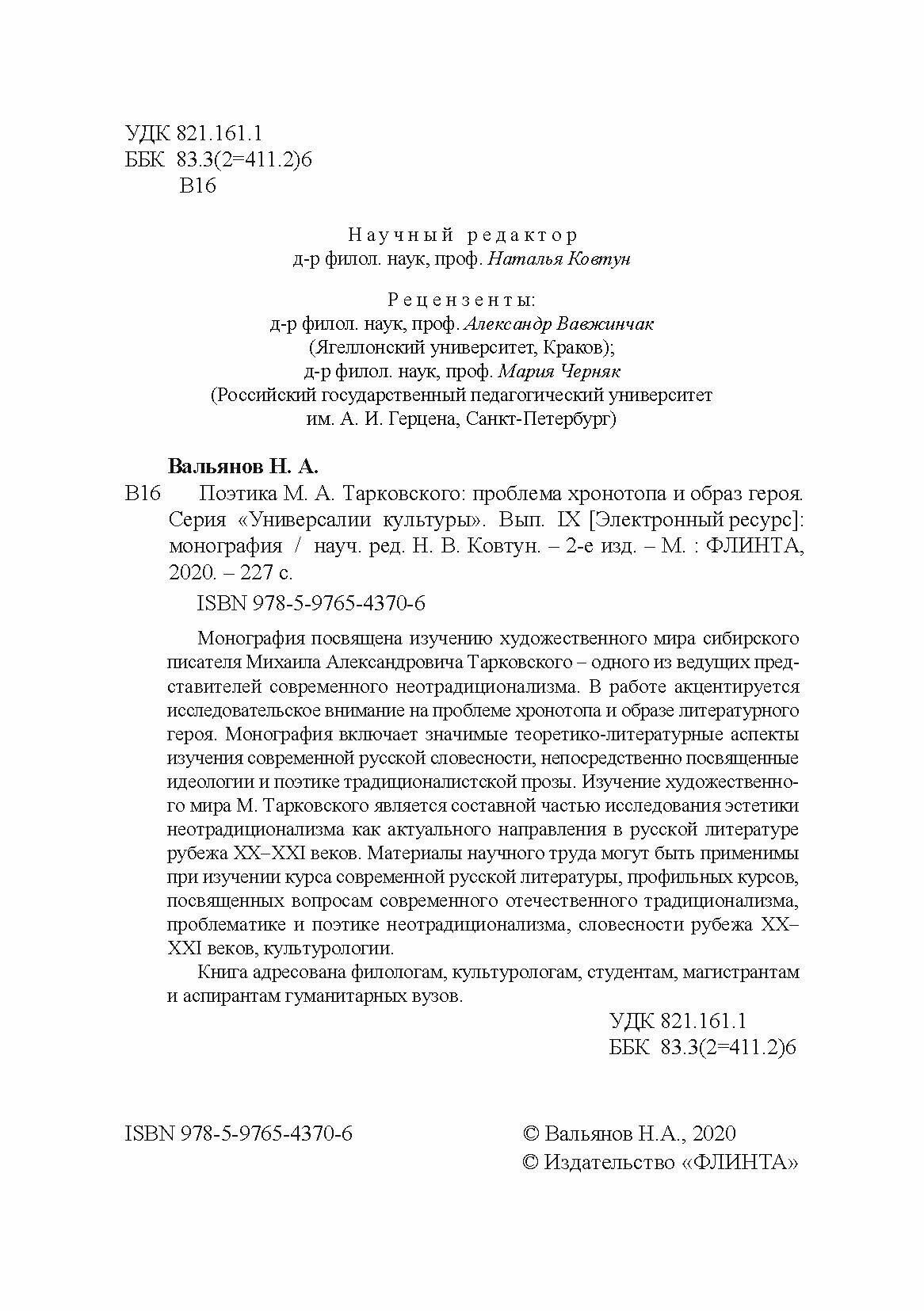 Поэтика М.А.Тарковского. Проблема хронотопа. Выпуск IX (Н. А. Вальянов); ФЛИНТА, 2020