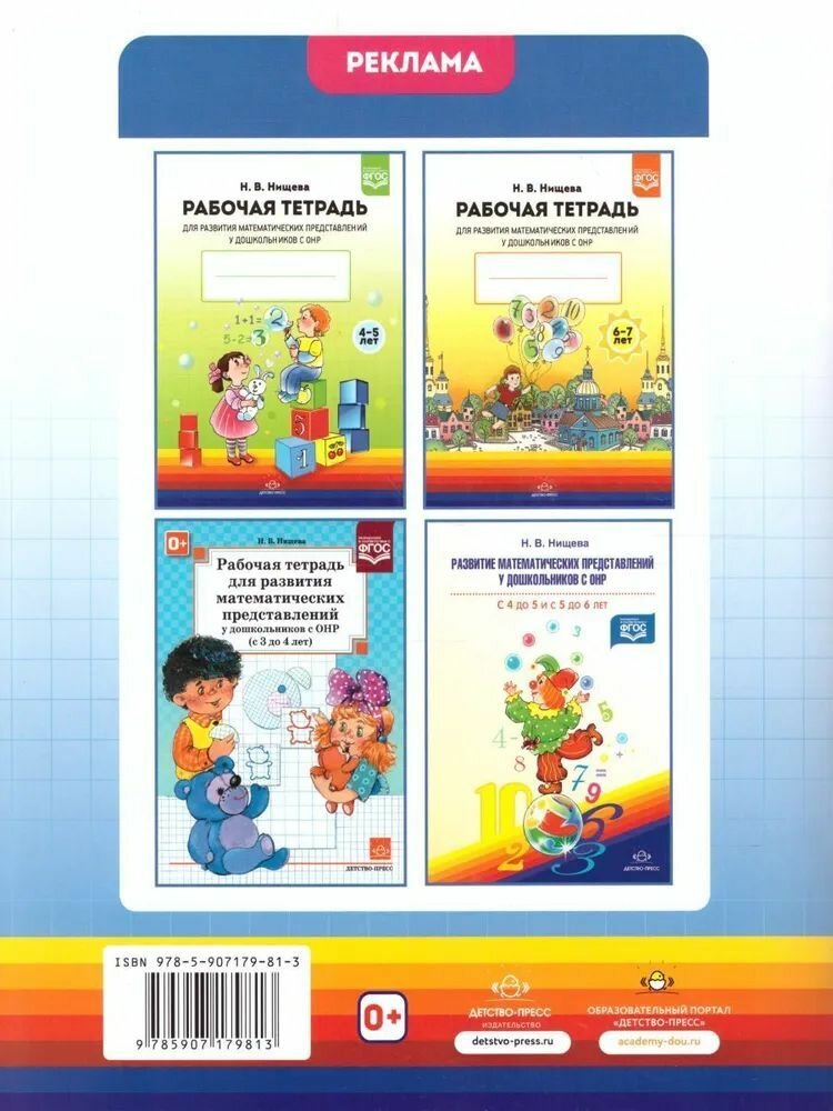 Рабочая тетрадь входит в методический комплект к пособию Н. В. Нищевой «Развитие математических представлений у дошкольников с ОНР (с 4 до 5 лет и с 5 до 6 лет)» и содержит игровые задания и упражнения для ознакомления с количественной моделью натурального ряда чисел, формирования навыка присчитывания по одному до заданного числа и счета двойками, сравнения предметов по длине, высоте, ширине, навыков ориентировки на плоскости, совершенствования умения узнавать и различать геометрические фигуры, что важно не только для познавательного, но и для речевого развития ребенка, так как создает фундамент для развития речи. Может использоваться как в работе с детьми с речевыми нарушениями, так и с детьми с нормальным речевым и интеллектуальным развитием. Рекомендовано педагогам ДОО и родителям дошкольников.
