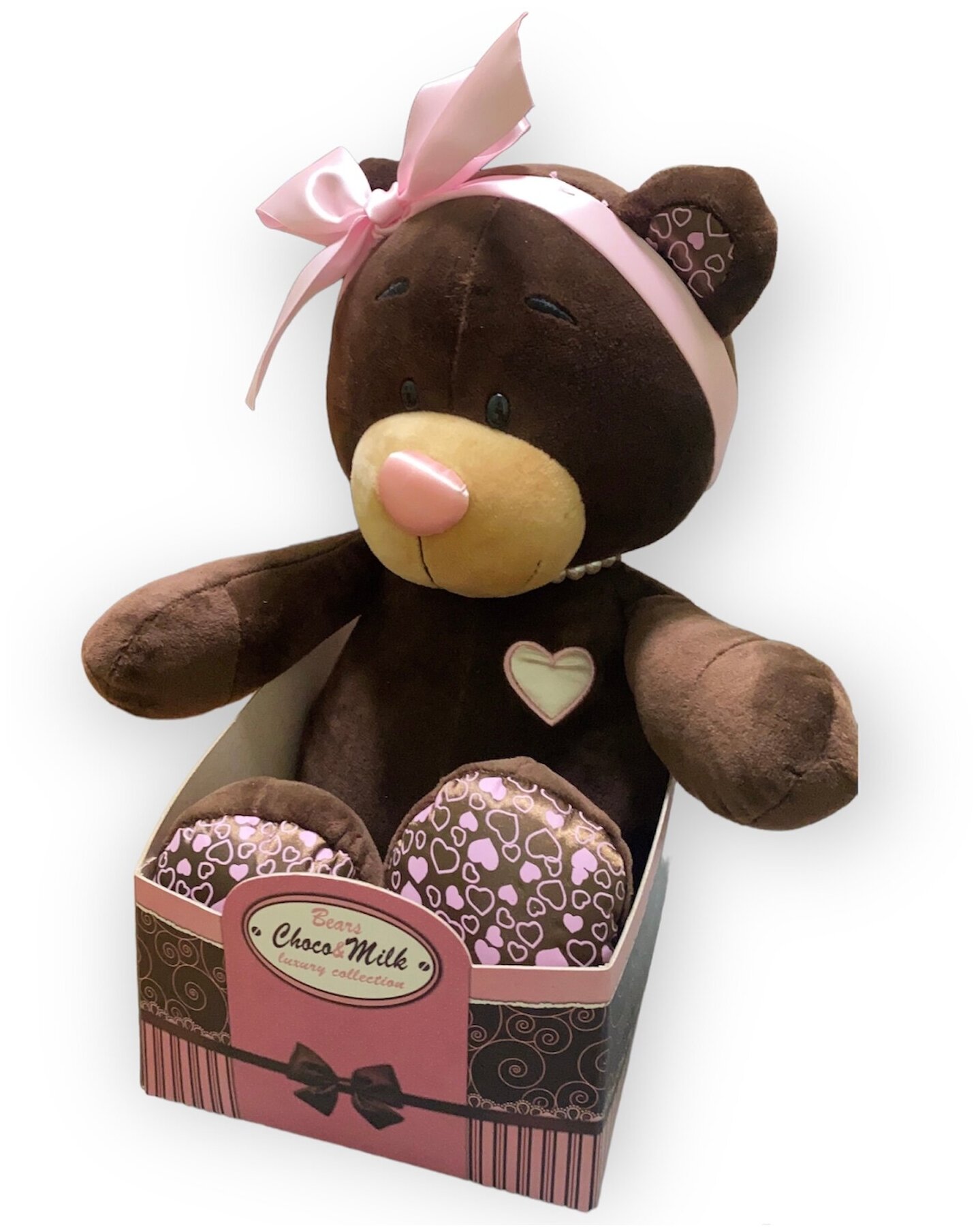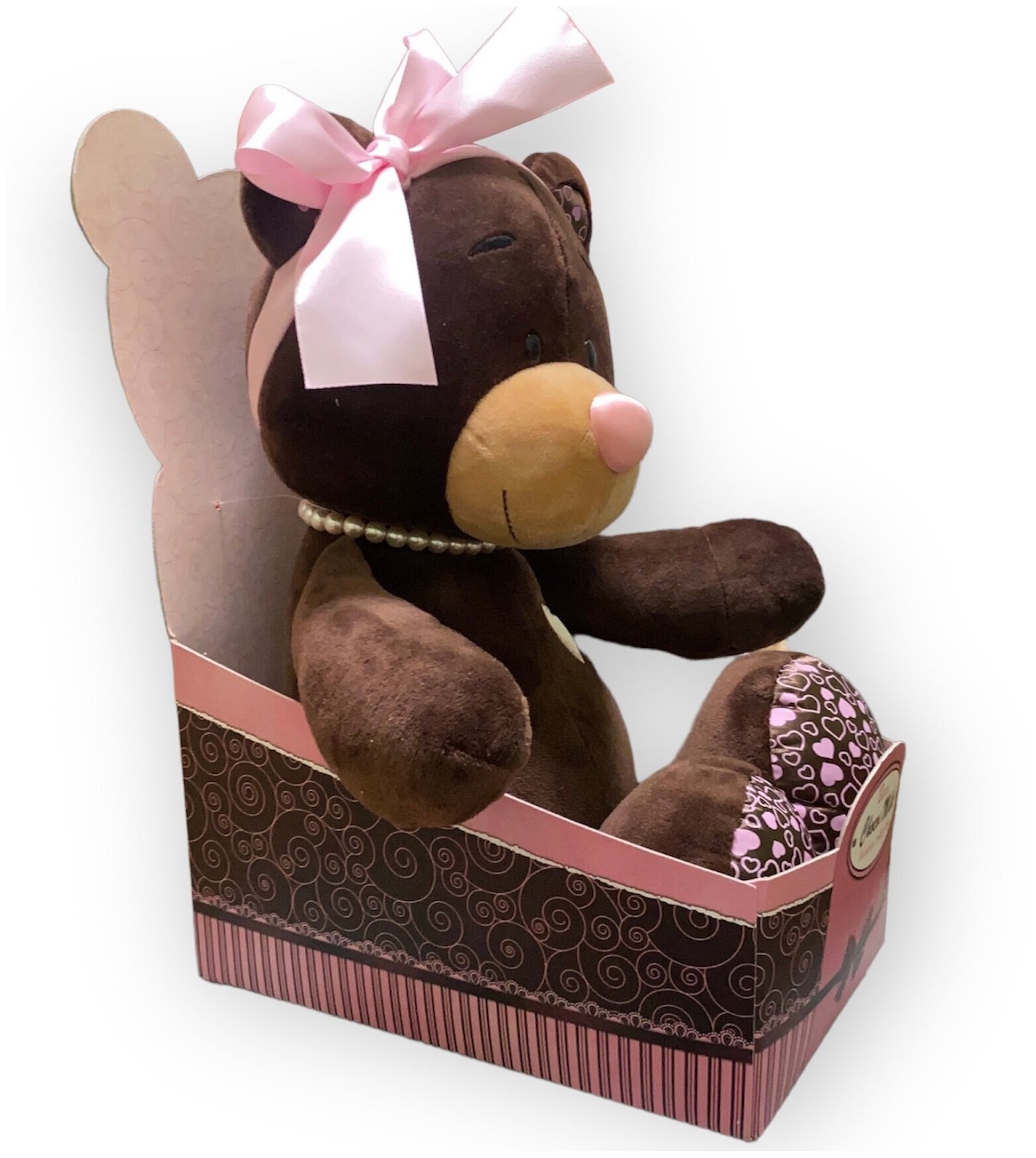Плюшевый медвежонок сидячий, девочка, с бантом и бусами.Наполнитель: полистирол, синтепон, в лапках - полиэтиленовые гранулы.Рост игрушки 30см.
