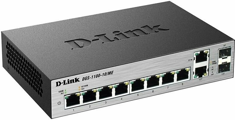 Коммутатор D-Link DGS-1100-10/ME/A2A Управляемый коммутатор 2-го уровня с 8 портами 10/100/1000Base-T и 2 комбо-портами 100/1000Base-T/SFP