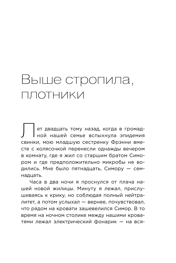 Есть среди коротких произведений Сэлинджера несколько работ, посвященных одной вымышленной семье Глассов. И вот когда читаешь подряд эти рассказы и повести, то в какой-то момент понимаешь, что тебе это семейство уже как родное. Ты их не то чтобы обожаешь, ты испытываешь к ним нежную привязанность. Сэлинджеру свойственно часто отклоняться от сюжетной линии, пихать куда ни попадя огромные сноски и всюду расставлять комментарии в скобках, но повесть «Выше стропила, плотники!» эти раздражающие мелочи обошли стороной.