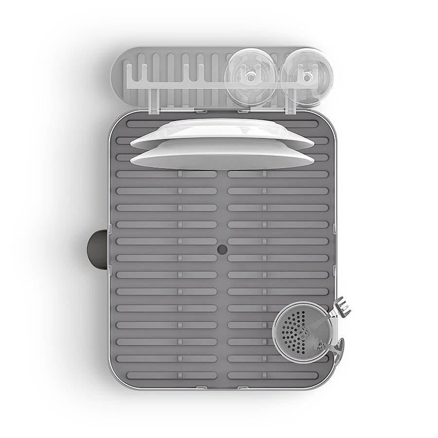Целый сушильный комплекс на вашей кухне! Многофункциональная сушилка для посуды, состоящая из стальной рамы и пластикового поддона. Решётка поддона рассчитана на сушку 15 тарелок. Кроме того, предусмотрено несколько съемных частей, которые можно конфигурировать так, как удобно вам: стакан для сушки столовых приборов, специальная рама для сушки винных бокалов и узкий боковой отсек c делениями для сушки ножей. Все эти части можно навешивать как внутри, так и снаружи сушилки. Снизу боковой части сушилки предусмотрен слив, который не даст воде застаиваться.