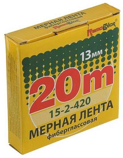 Фибергласовая мерная лента (20 мх13 мм) Remocolor 15-2-420 предназначена для измерения расстояний во время строительных работ., Закрытый корпус из ударопрочного пластика является гарантией долговечности., Изделие оснащено ручкой для быстрого и удобного сматывания ленты.