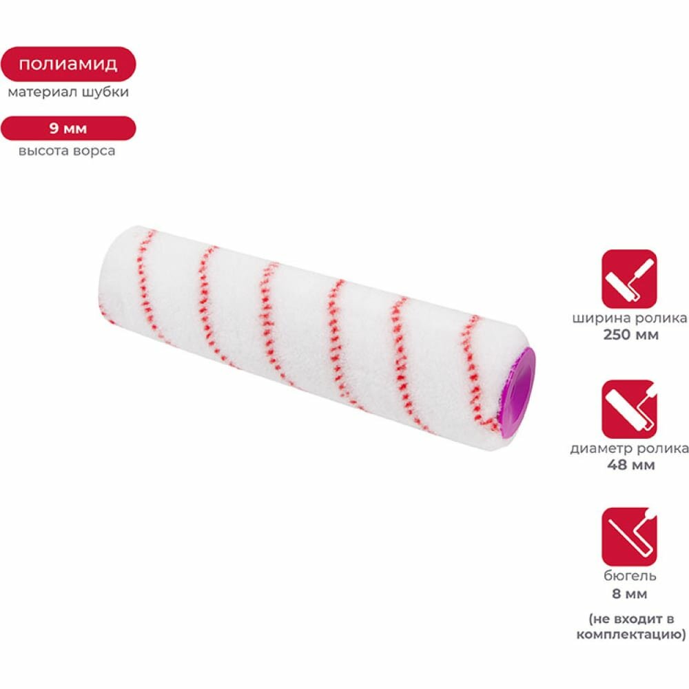 Валик выполнен из полиамида и имеет высоту ворса 9 мм. Ширина ролика 250 мм, диаметр 48 мм. Валик обеспечивает равномерное нанесение состава на гладкие поверхности.