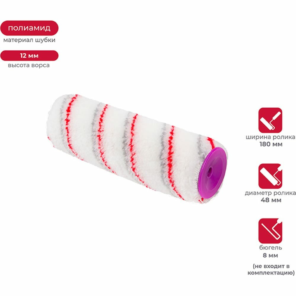 Валик выполнен из полиамида и имеет высоту ворса 12 мм. Ширина ролика 180 мм, диаметр 48 мм. Валик обеспечивает равномерное нанесение состава на гладкие поверхности.