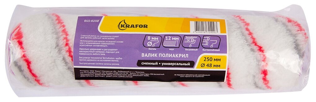 Валик выполнен из полиамида и имеет высоту ворса 12 мм. Ширина ролика 250 мм, диаметр 48 мм. Валик обеспечивает равномерное нанесение состава на гладкие поверхности.