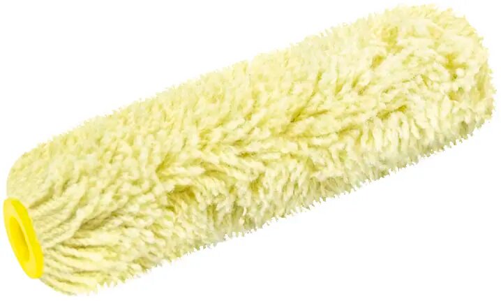 Запасной валик выполнен из полиакрила и имеет высоту ворса 12 мм. Ширина ролика 100 мм, диаметр 16 мм. При окрашивании ворс из шубки не выпадает, лакокрасочный материал ложится на поверхность без дефектов.
