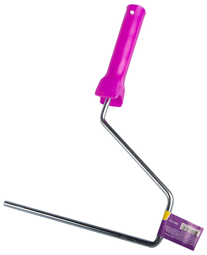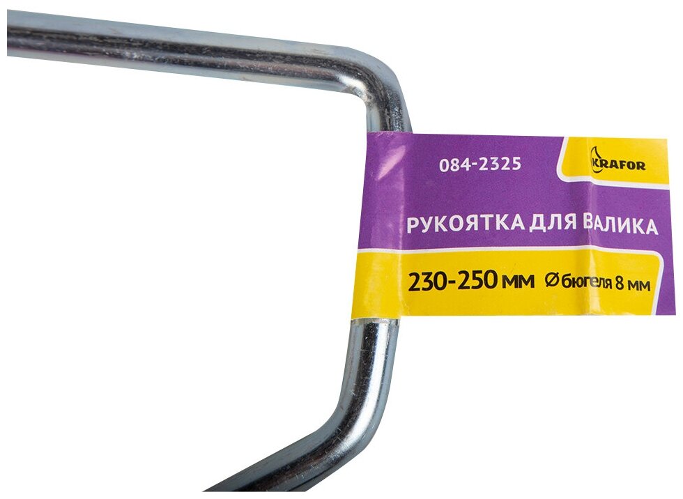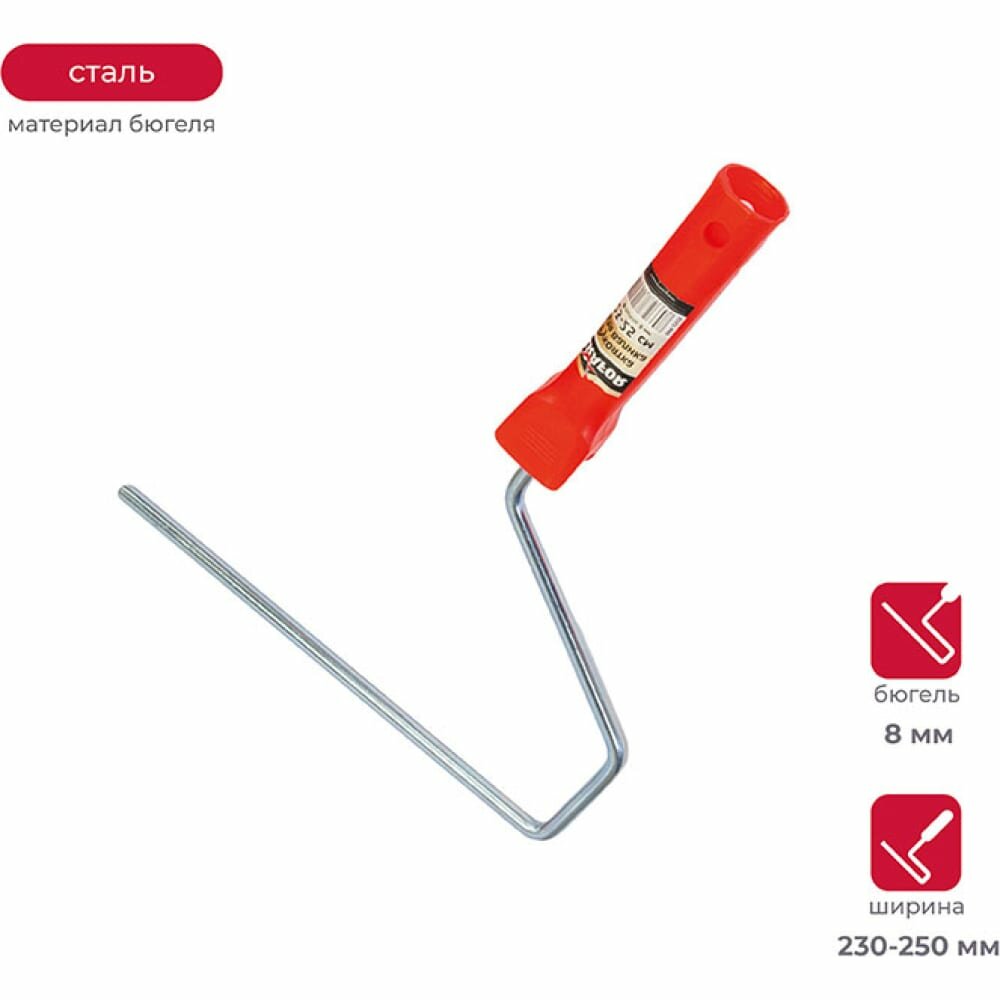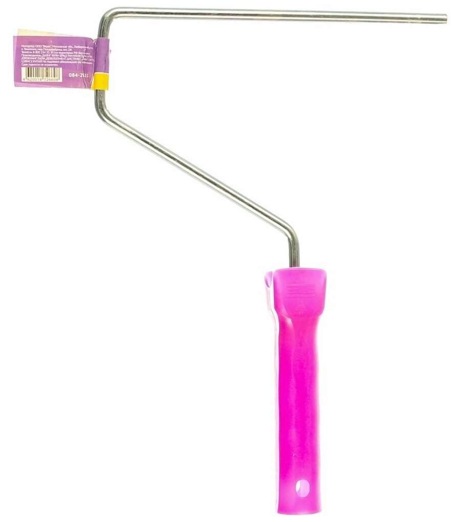 Изделие представляет собой оснастку для рабочей части малярного валика. Пластиковая рукоятка с отверстием под телескопический стержень. Материал бюгеля - сталь. Рукоятка удобно ложится в руке и не выскальзывает при окрашивании, что обеспечивает комфорт при использовании инструмента. Каркас обеспечивает надежное крепление сменных валиков. Инструмент легко очищается водой.
