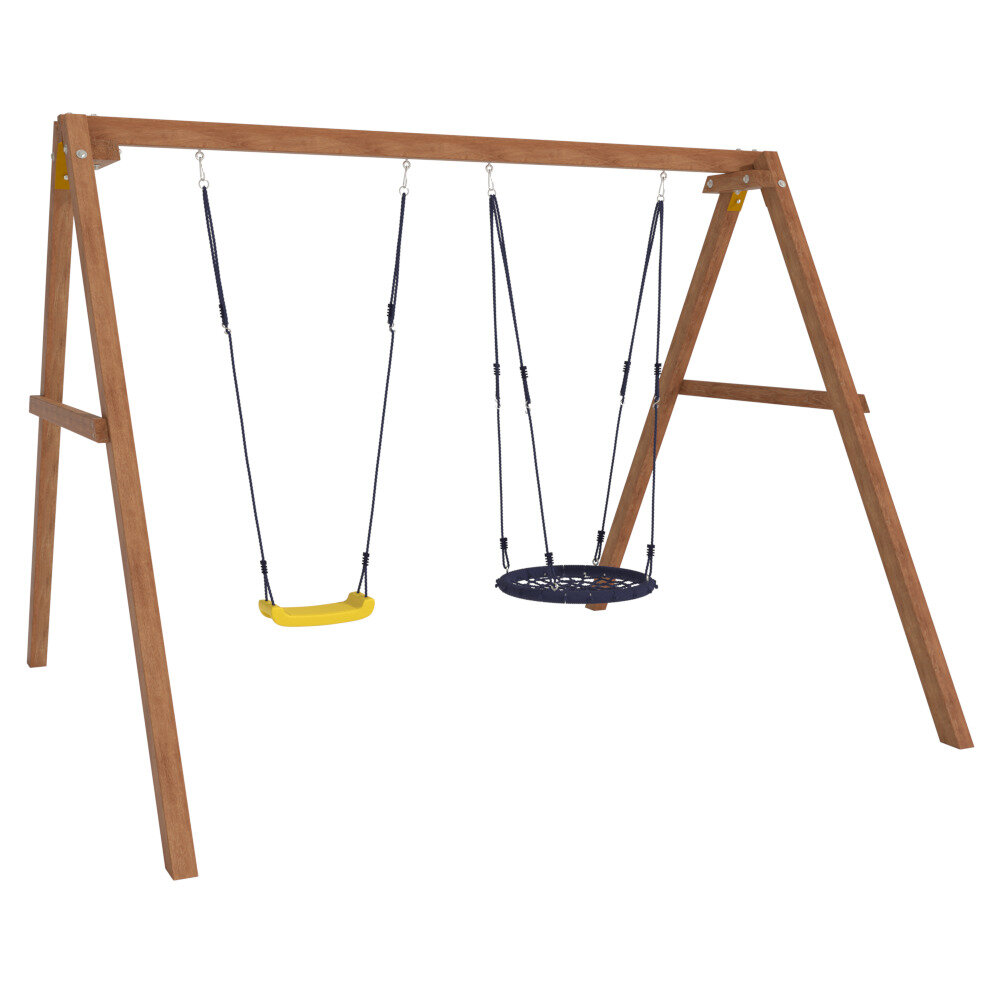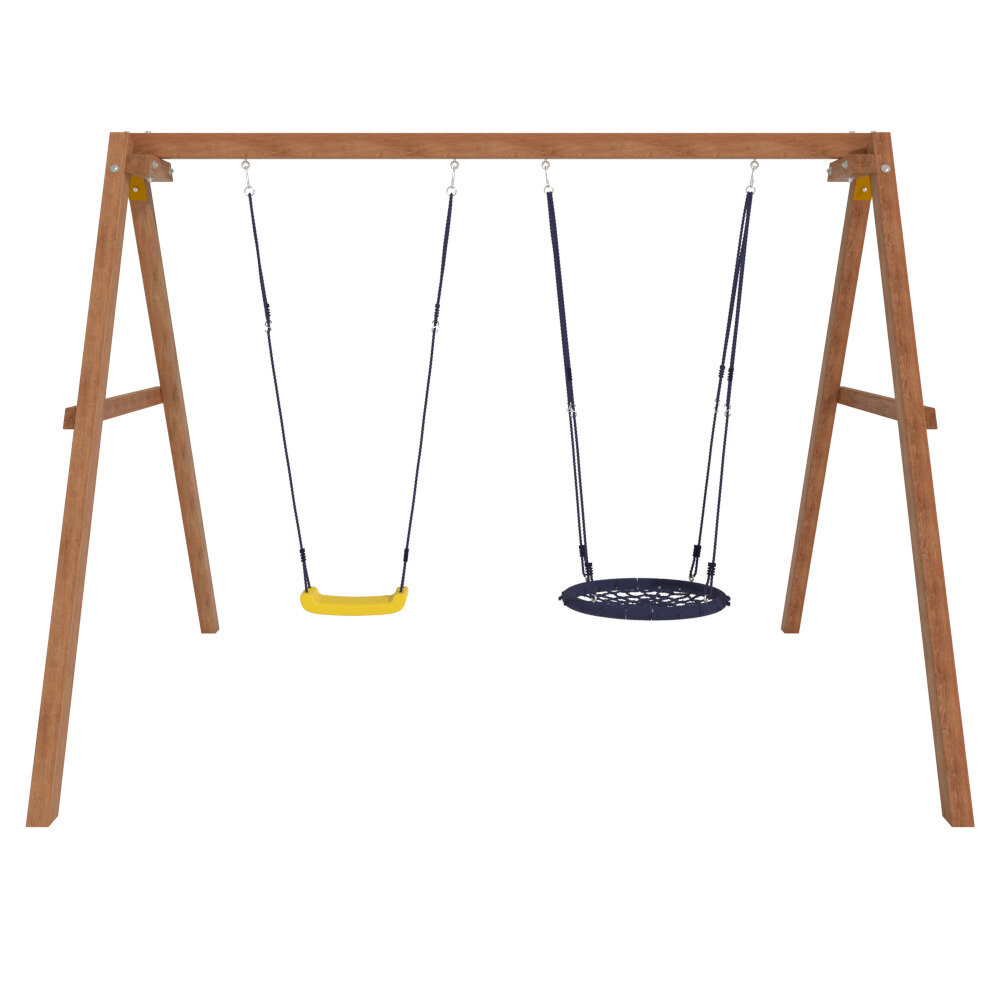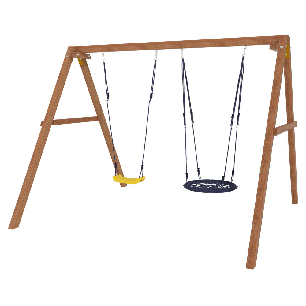 Комплекс с качелями и гнездом 60 см изготовлен из качественных материалов. Этот уличный вариант отлично подходит для использования на даче и во дворе частного дома. Игровые качели с легкостью устанавливаются на любой свободной от насаждений ровной территории. Данное изделие позволит малышам весело развлечьсяс максимальной пользой для вестибулярного аппарата. Качели будут развивать ловкость и силу мышц ребенка, способствовать здоровому физическому развитию, дарить хорошее настроение и заряжать позитивными эмоциями. Особенностью данного товара является высокое качество материалов и прочность крепления всех элементов.
