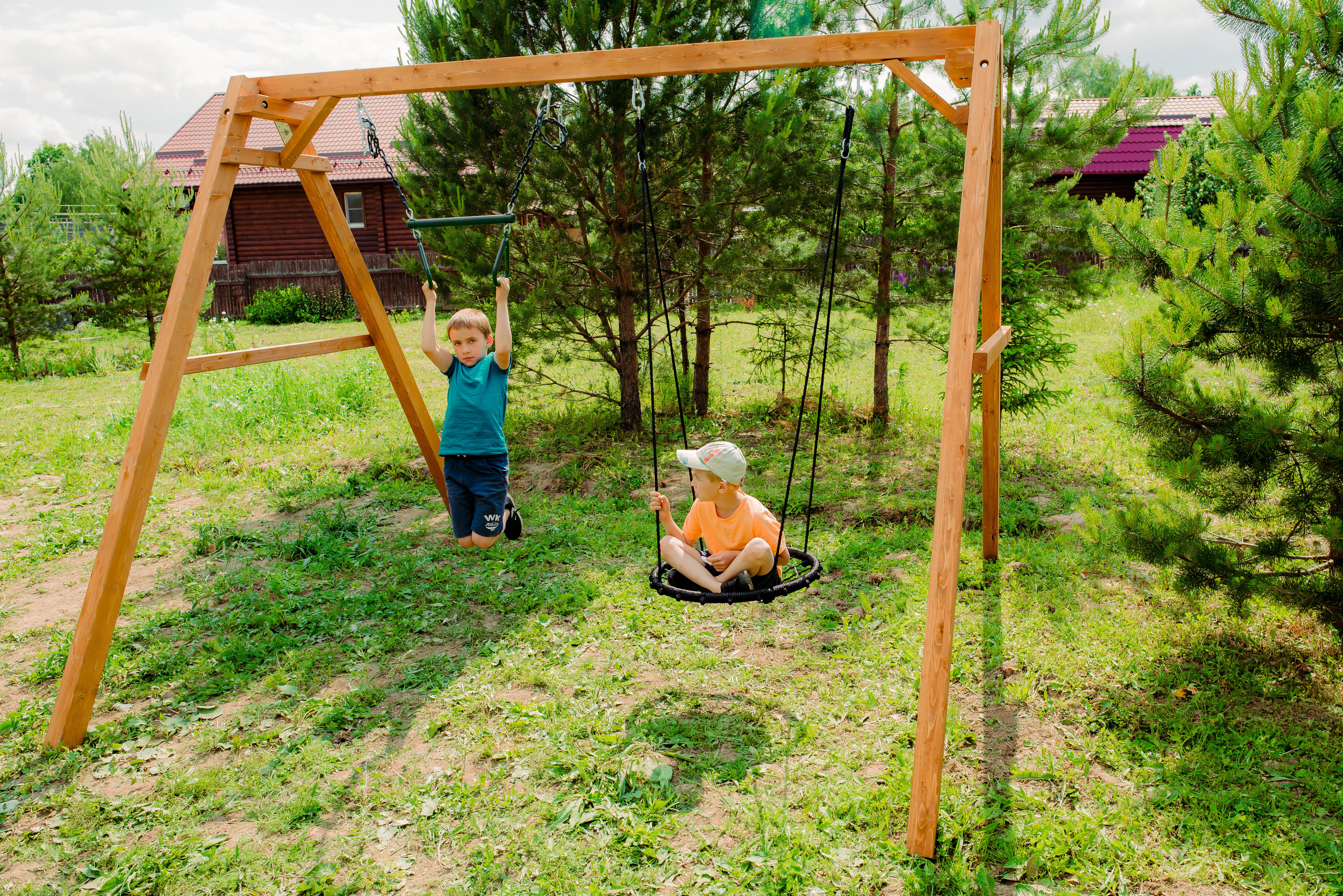 Этот уличный вариант отлично подходит для использования на даче и во дворе частного дома. Игровые качели с легкостью устанавливаются на любой свободной от насаждений ровной территории.