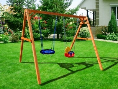 Этот уличный вариант отлично подходит для использования на даче и во дворе частного дома. Игровые качели с легкостью устанавливаются на любой свободной от насаждений ровной территории.