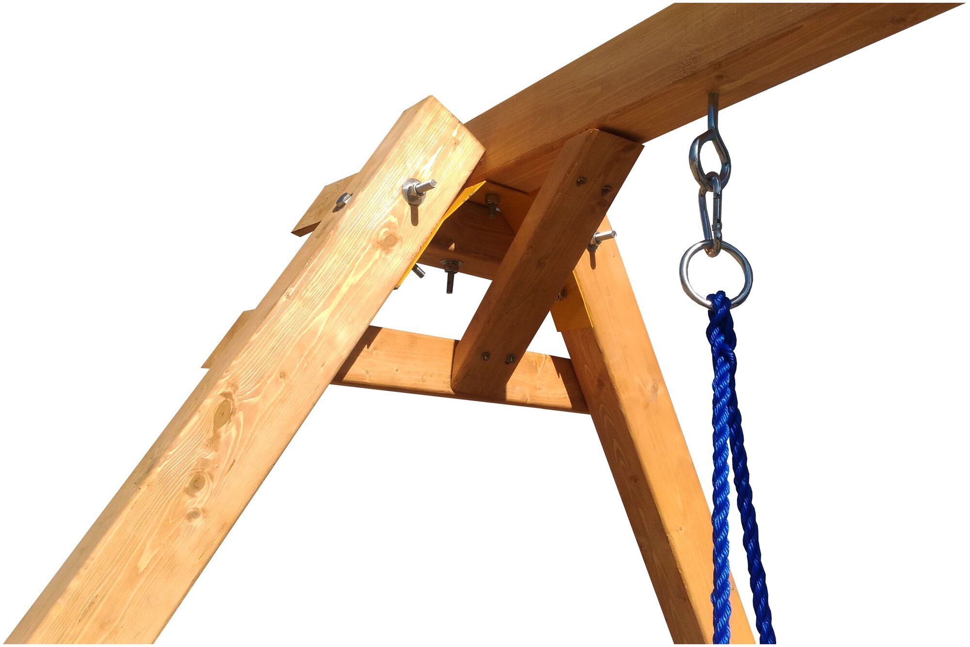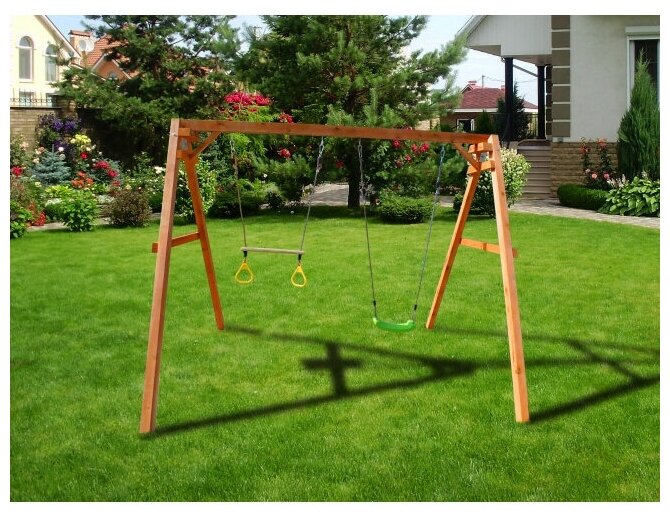 Этот уличный вариант отлично подходит для использования на даче и во дворе частного дома. Игровые качели с легкостью устанавливаются на любой свободной от насаждений ровной территории.