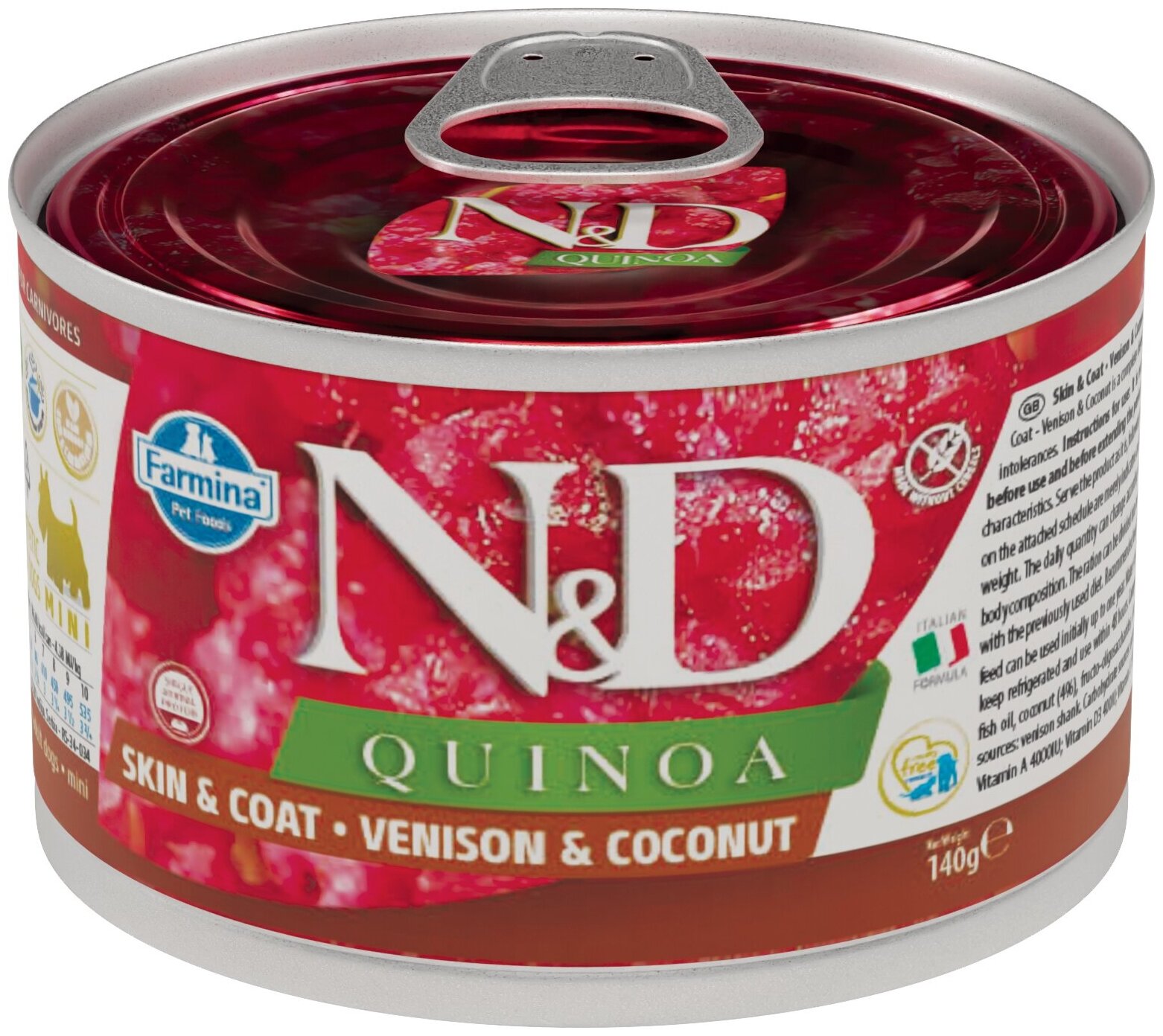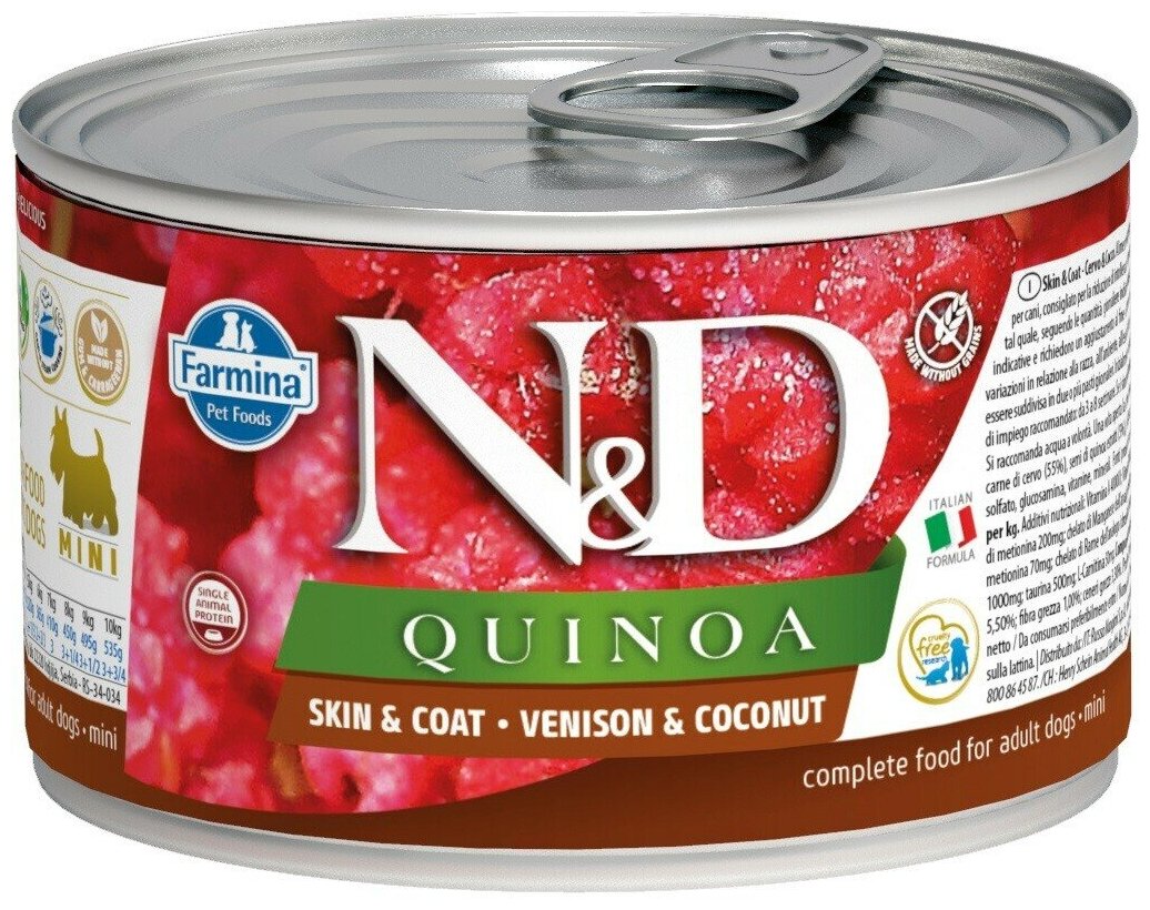Влажный корм для собак Farmina N & D Quinoa с олениной и кокосом. Предназначен для кормления взрослых собак маленьких пород. Это полнорационный диетический корм, который используется для снижения пищевой непереносимости питательных веществ у животного.