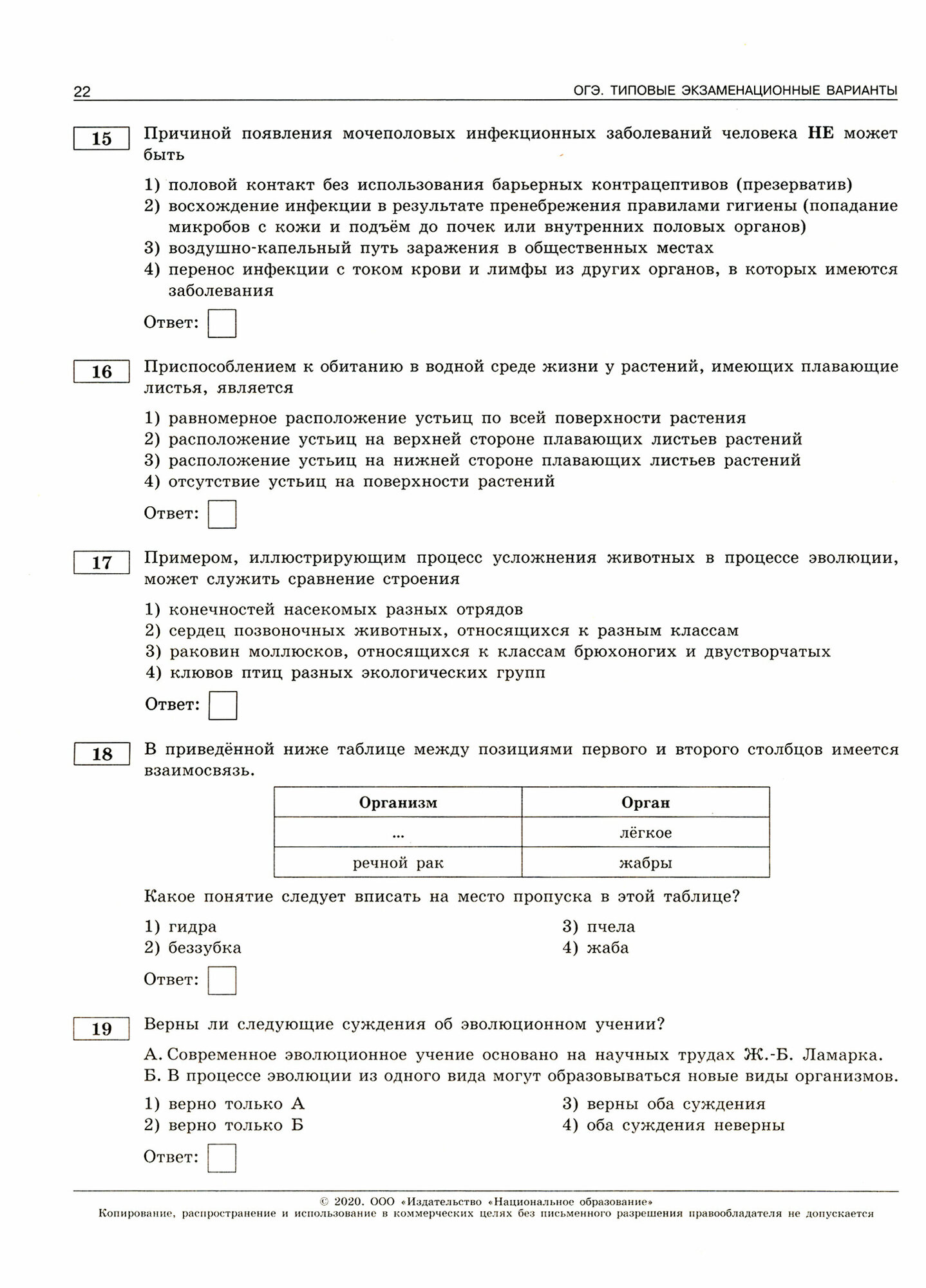 ОГЭ-20 Биология. Типовые экзаменационные варианты. 10 вариантов (Рохлов Валериан Сергеевич, Бобряшова Ирина Александровна, Галас Татьяна Александровна, Саленко Вениамин Борисович); Национальное образование, 2020