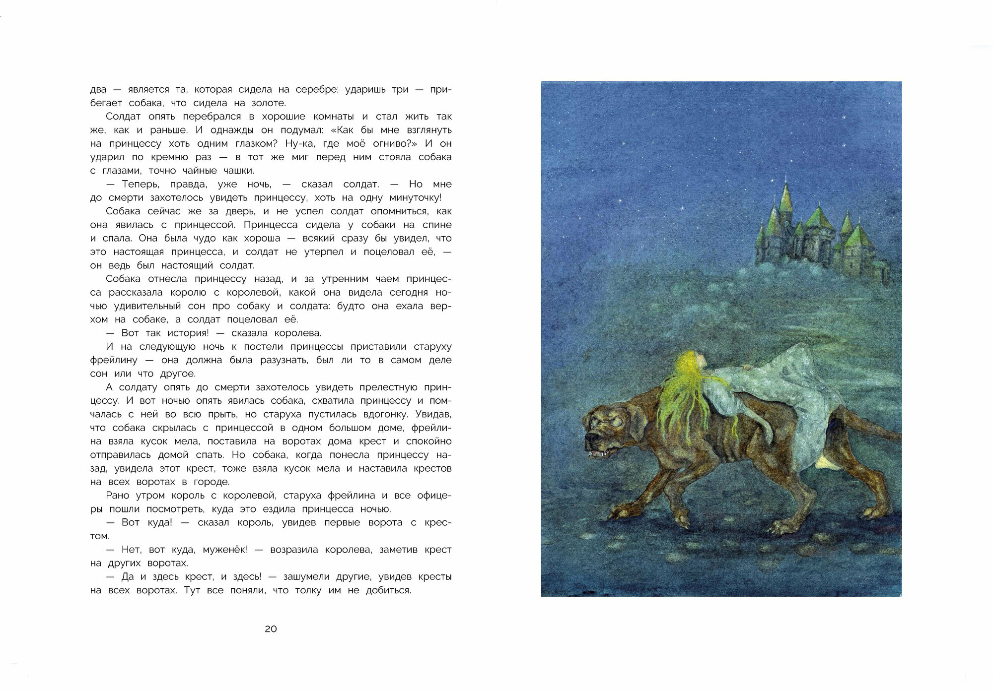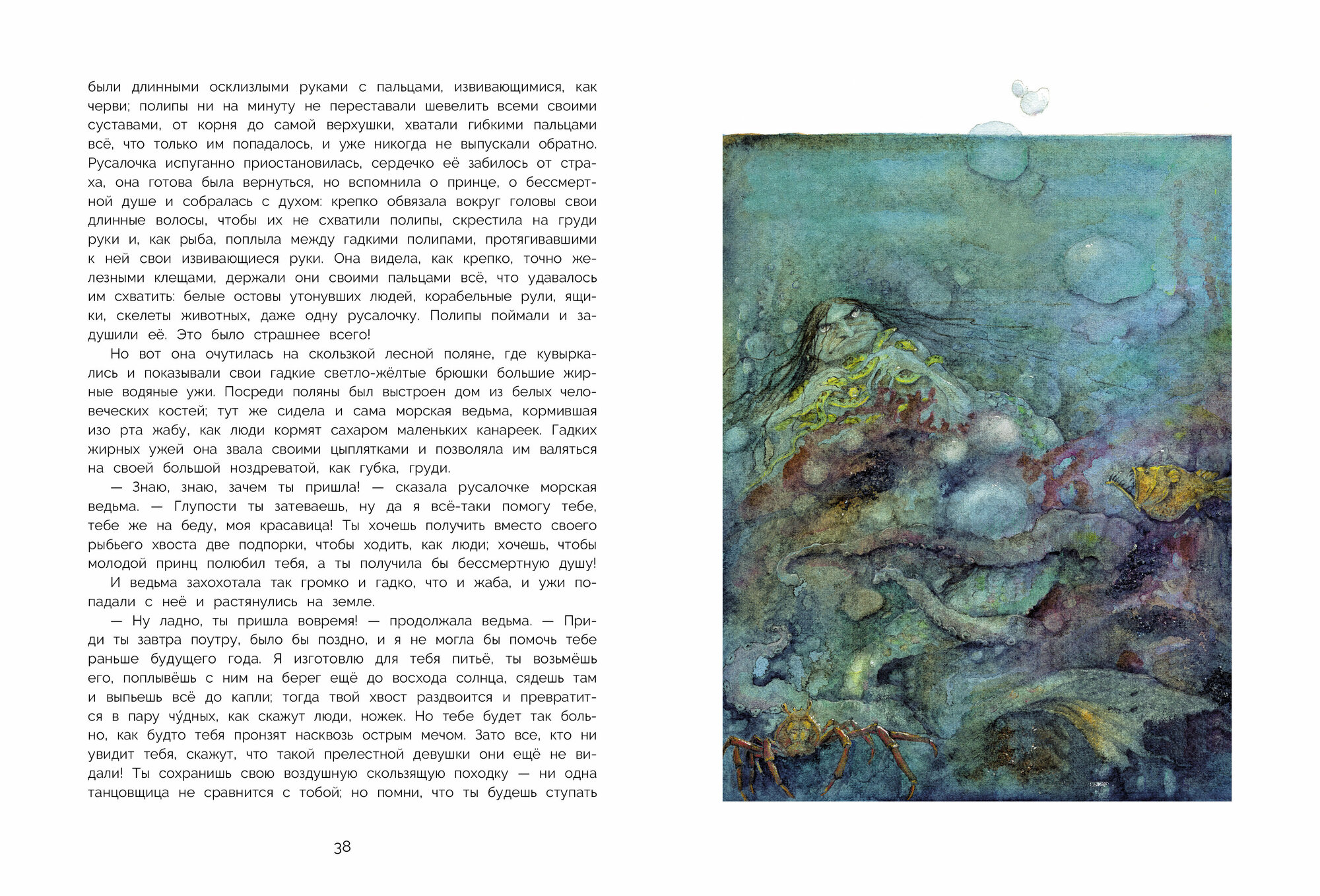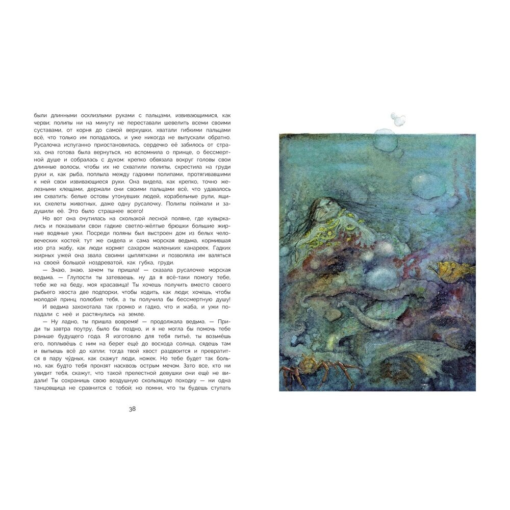 Для того, чтобы купить эту книгу, надо четко понимать, зачем, потому что цена немаленькая. Идеально - для подарка, потому что привлекательная обложка, мелованная бумага, интересные атмосферные иллюстрации известной художницы, хорошая подборка сказок Андерсена. Для домашней библиотеки хороша только, если вы большой фанат Даниэлы Дрешер или в принципе коллекционируете издания Андерсена в исполнении разных художников. Правда, за такую цену можно пополнить свою коллекцию парой-тройкой не менее чудесных изданий не менее талантливых художников. Если же просто взять ребенку книгу сказок Андерсена, то половину стоимости вы заплатите за бумагу, а иллюстрации ребенок, возможно, и не оценит. Это больше иллюстрации для взрослых, ценителей тонкого искусства. Такая бумага хороша для художественных альбомов, но дело в том, что это не художественный альбом, это книга для детей. Так вот как книга для детей и как художественный альбом она мало пригодна, потому что в ней мало иллюстраций. Бесконечные развороты сплошного текста на роскошной бумаге - не уверена, что оно того стоит. В художественных альбомах, по крайней мере, картинок побольше. Здесь примерно пара иллюстраций на каждую сказку, поэтому большинство ключевых сцен в самых известных сказках остались за кадром. Видимо, чтобы компенсировать недостаток иллюстраций, в книгу поместили много черных растительных и животных элементов - этакий трафаретный декор и черно-белых эскизов. Например, на одну из самых длинных и популярных сказок "Снежная Королева" - шесть больших иллюстраций и четыре маленьких элемента. Тем, кто собирает разные издания "Снежной Королевы", особо восхищаться негде - есть гораздо более привлекательные исполнения. Не любит Даниэла Дрешер "Снежную Королеву", не зажигает она ее. В "Диких лебедях" нет лебедей, для меня это странно. В "Русалочке " 4 больших иллюстрации, только две из них - ключевые моменты истории. В "Свинопасе" нет свинопаса. В "Гадком утенке" нет вообще никого, кроме утенка - один черно-белый эскиз, один черный трафарет, один акварельный набросок - и одна полноценная иллюстрация на страницу, которая пошла на обложку книги. Главная иллюстрация для "Оловянного солдатика" - огромная крыса. Балерина лишь в наброске. В "Огниве" нет солдата, прекрасная принцесса лишь намечена, зато есть страшная-престрашная собака. Многие иллюстрации очень темные или размытые, даже если таковы оригиналы, то для детей как-то не очень. В общем, я бы охарактеризовала эту книгу как альбом акварелей Даниелы Дрешер. Акварели у нее хорошие. Но при чем здесь Андерсен? Подборка сказок достойная - из 21 сказки половина хорошо известные и любимые истории.