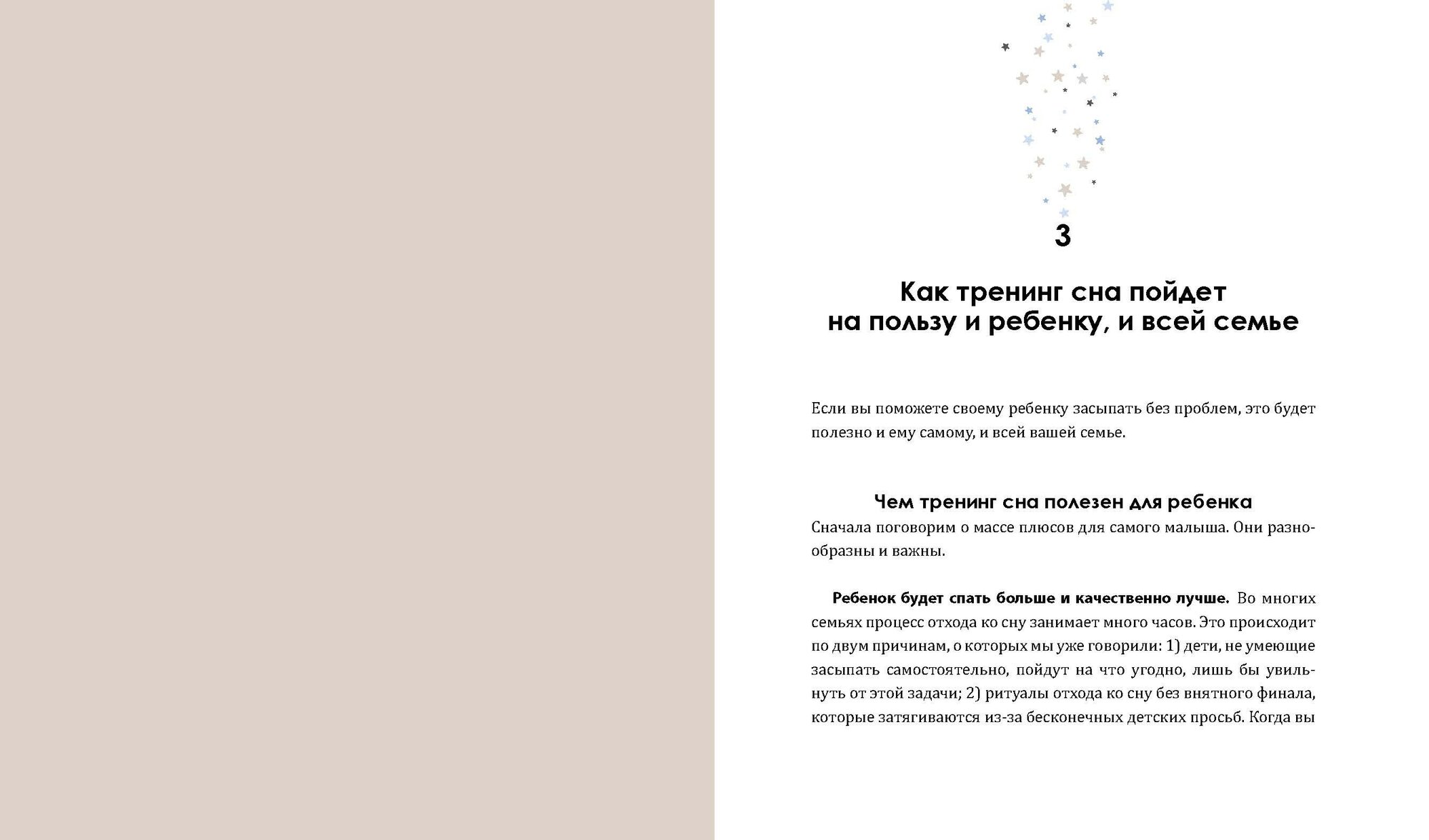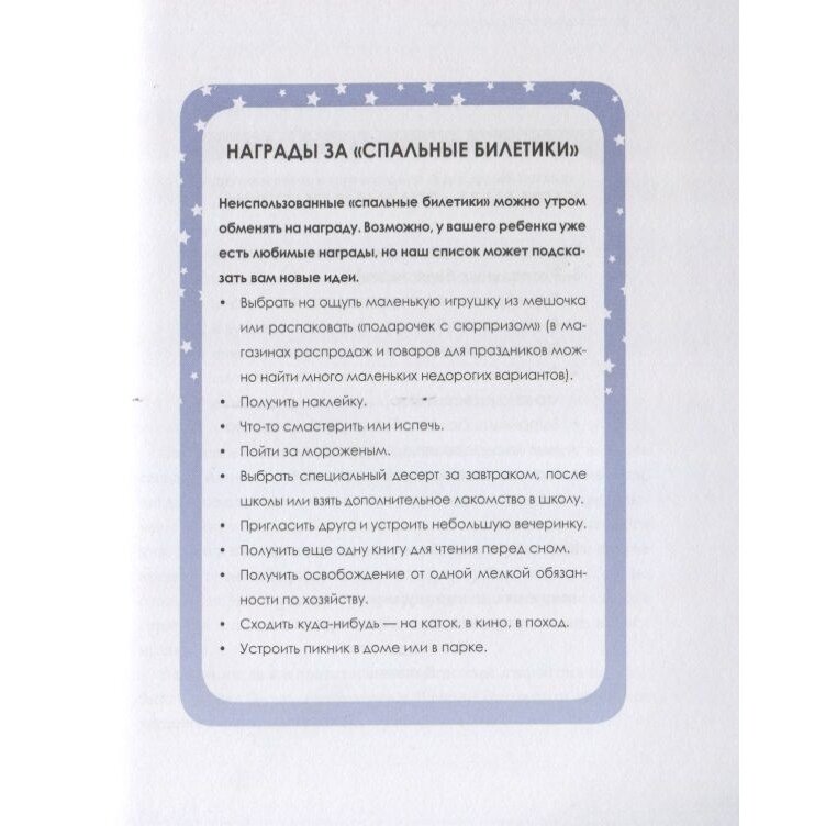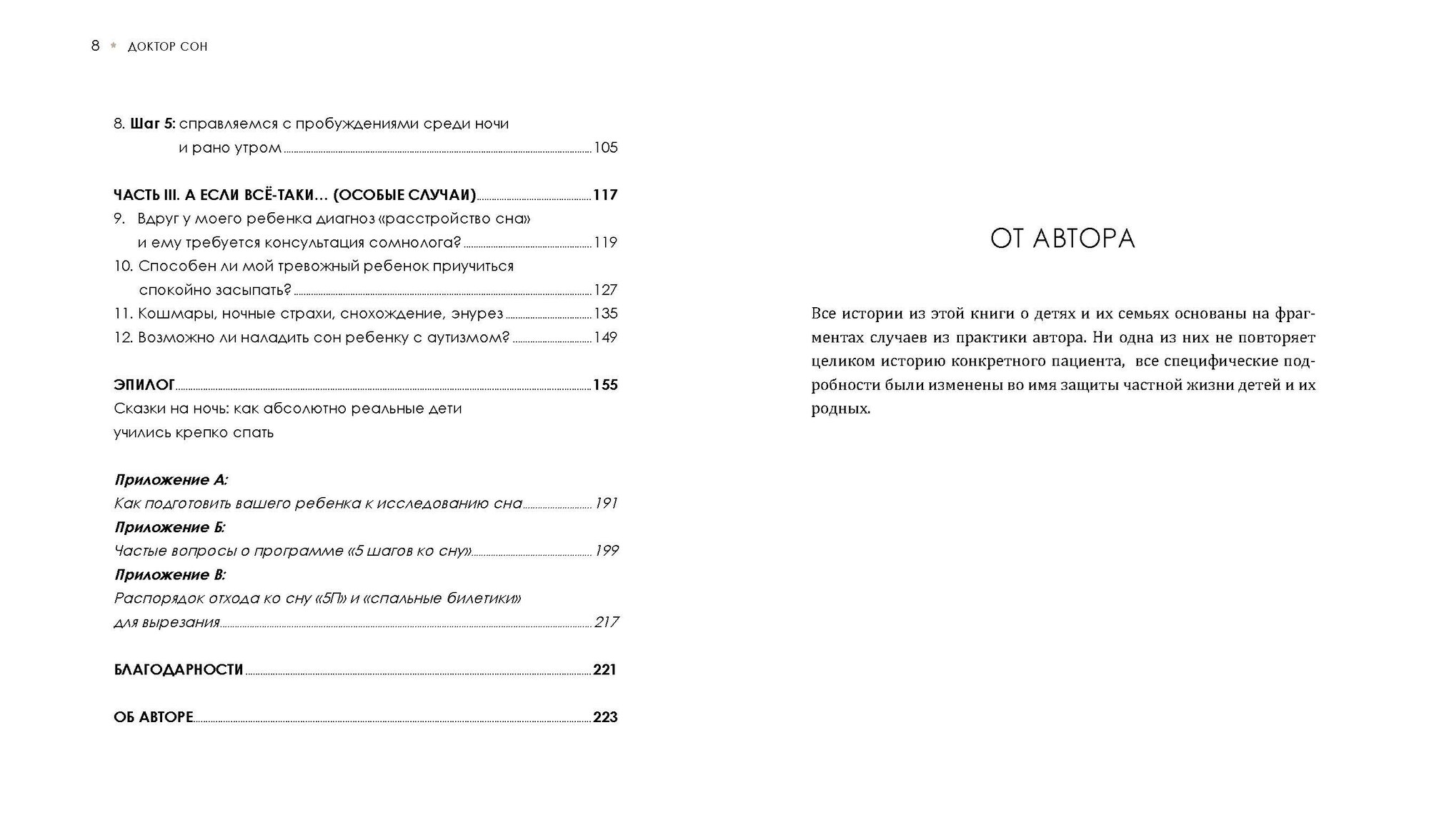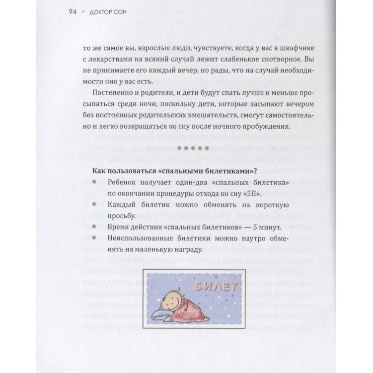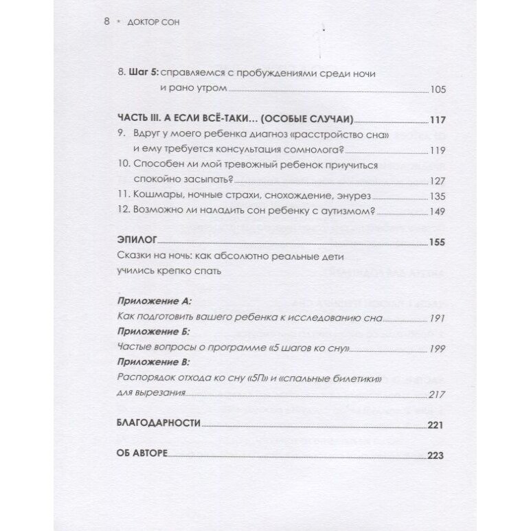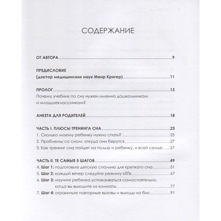 Купила книгу из-за проблем со сном у ребенка 6ти лет. Если честно, до этой книги прочитала несколько по этой же теме, но результата было 0. Начав читать эту, была не уверена в успехе, как и с предыдущими книгами, НО! попробовав те приемы, которые описаны в книге, увидела результат уже с первого же раза. Написано все доходчиво, удобно резюмировано в конце каждого блока, текст / шрифт - все удобно. На данный момент прочитано половину и (о чудо) ребенок засыпает сам уже больше 2х недель без слез и ночных «блужданий». Резюмирую: книгу стоит прочитать, если у вас есть проблемы с засыпанием ребенка, но и не ждите «волшебной пилюли»-это работа (ваш личный труд) на пути спокойного и крепкого сна ребенка. Книга-только канат для определения верного пути.