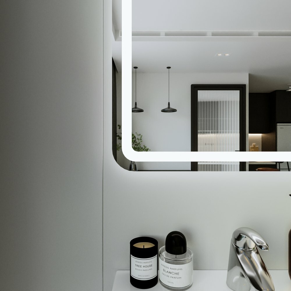 Большое зеркальное полотно с подсветкой, на взмах руки, навески для крепления к стене. Светодиодная подсветка, трансформатор для светодиодных светильников, электрический провод 0.5 м для подключения к электросети 220В.