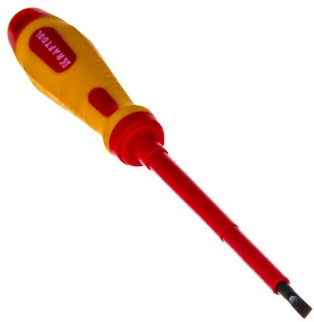 Высоковольтная отвёртка Kraftool — это профессиональный инструмент, предназначенный для проведения слесарно-монтажных работ.Преимущества: Материал стержня: хромомолибденовая сталь. Это обеспечивает прочность и долговечность инструмента. Тип шлица: прямой, размер SL4.0. Такая форма позволяет работать с различными видами винтов и саморезов. Длина стержня: 100 мм. Это даёт возможность проникать в труднодоступные места и облегчает работу в ограниченном пространстве. Диэлектрическое покрытие. Оно защищает оператора от поражения электрическим током при работе с оборудованием под напряжением. Намагниченный наконечник. Это позволяет использовать отвёртку для работы с винтами, находящимися в глубине отверстий или пазов. Толщина стержня: 0,8 мм. Такой размер обеспечивает надёжное сцепление с крепежом и предотвращает проскальзывание отвёртки. Индивидуальное тестирование на пробой. Каждая отвёртка проходит проверку на соответствие заявленным характеристикам и стандартам качества.