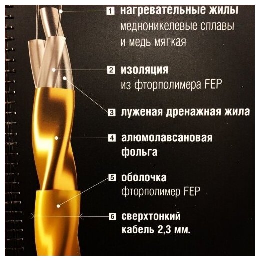 Содержание драгоценного металла, золота, в изоляции повышает теплоотдачу теплого пола, и следовательно эффективность.Две нагревательные жилы более равномерно распределяют тепло, выделяемое в нагревательном кабеле, что позволяет снизить максимальную температуру на нагревательной жиле, это в свою очередь снижает опасность перегрева нагревательного кабеля. В качестве нагревательной жилы используются сплавы сопротивления, медно-никелевые сплавы и медь мягкая. Все данные металлы и сплавы по назначению являются электротехническими, удельное сопротивление у них более стабильно, следовательно, у нагревательного кабеля более стабильна выделяемая мощность.