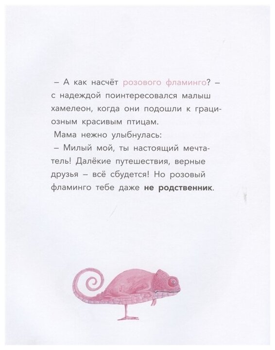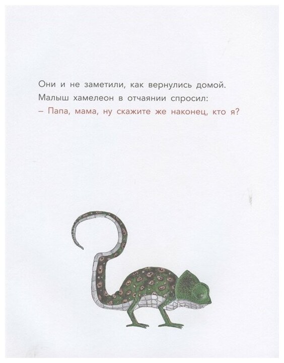 Мама предлагает ему отправиться в небольшое приключение и поискать ответ вместе. Может быть, малыш — полосатая зебра? Ведь она бегает так же быстро, как он! Или жираф? У них на спине одинаковые пятнышки... А как же хочется стать таким же большим как жираф! А может быть, и вовсе слон? Или бабуин... Но сколько малыш хамелеон не сравнивает себя с другими животными, он не находит похожего на себя. Наконец он понимает, как хорошо быть самим собой и самым любимым для своих родителей.