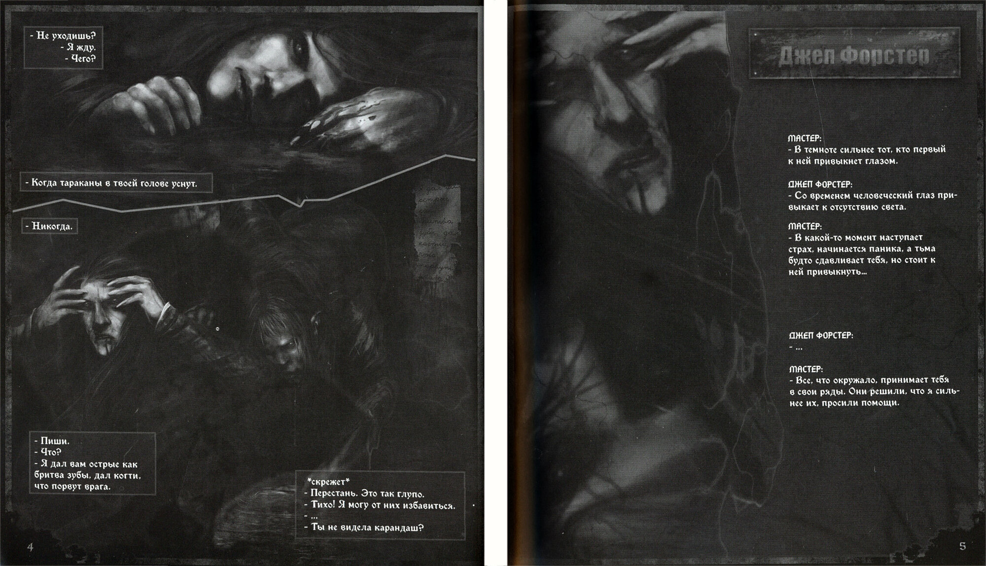 Полностью авторские, выполненные монохромно. Тысячи оттенков серого как нельзя лучше передают гнетущую атмосферу, безысходность и отчаяние. Живые эмоции на лицах героев, полутонов и даже животные—складываются в единую картину.
