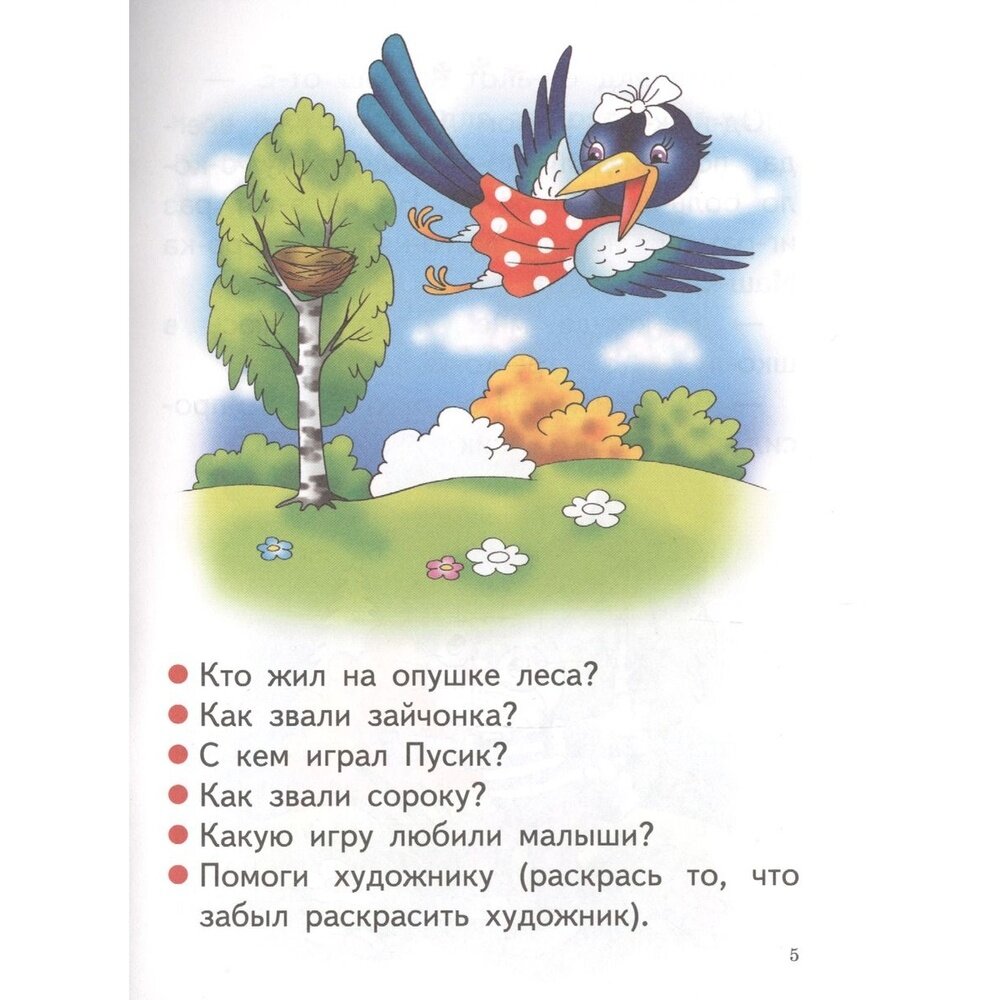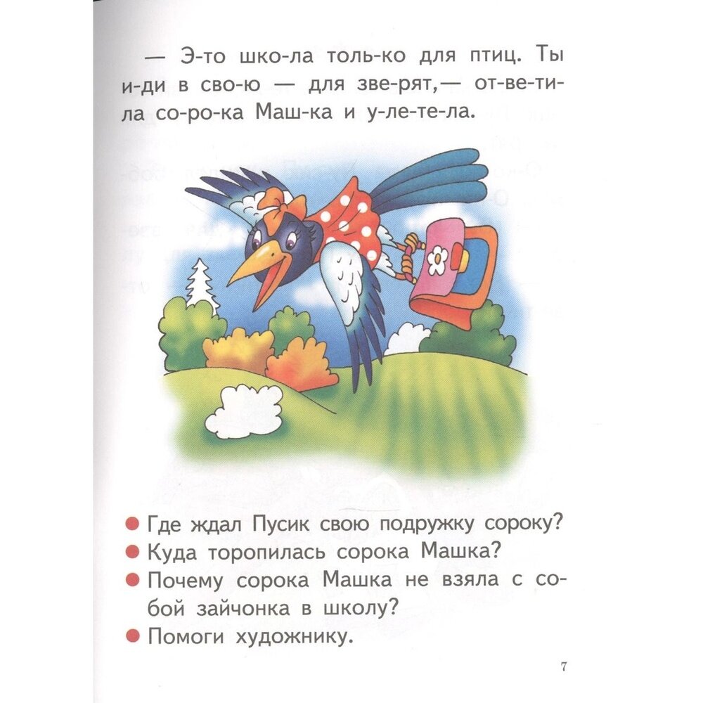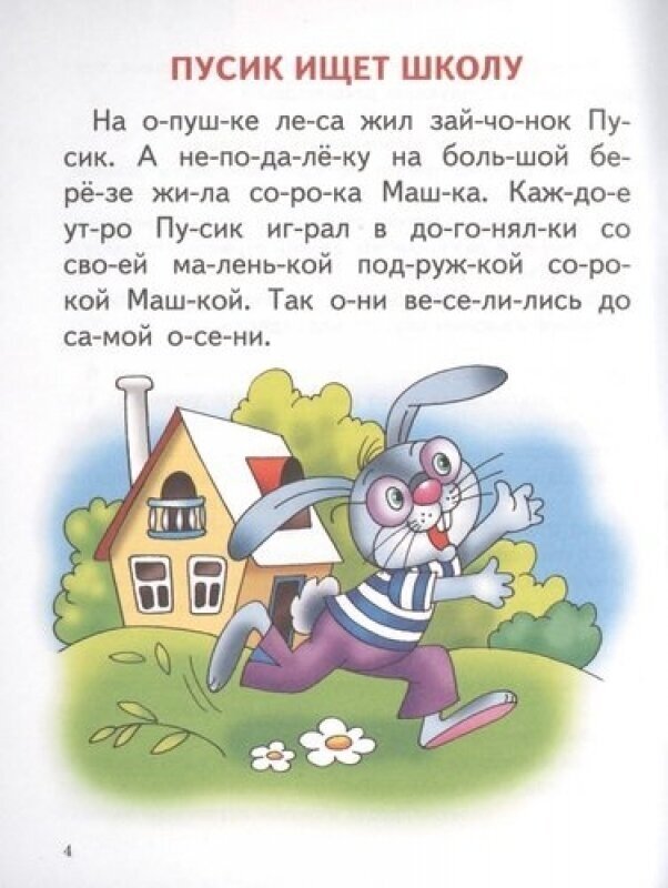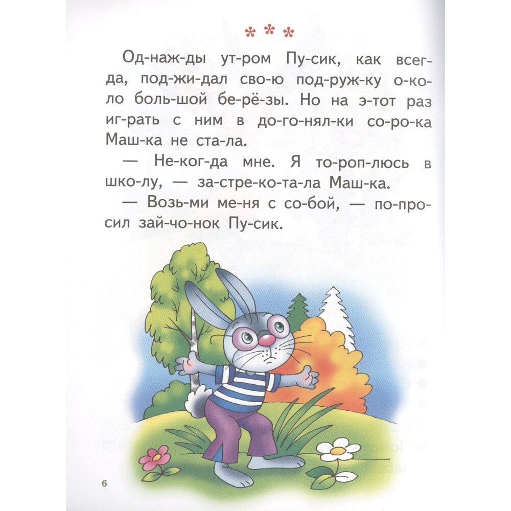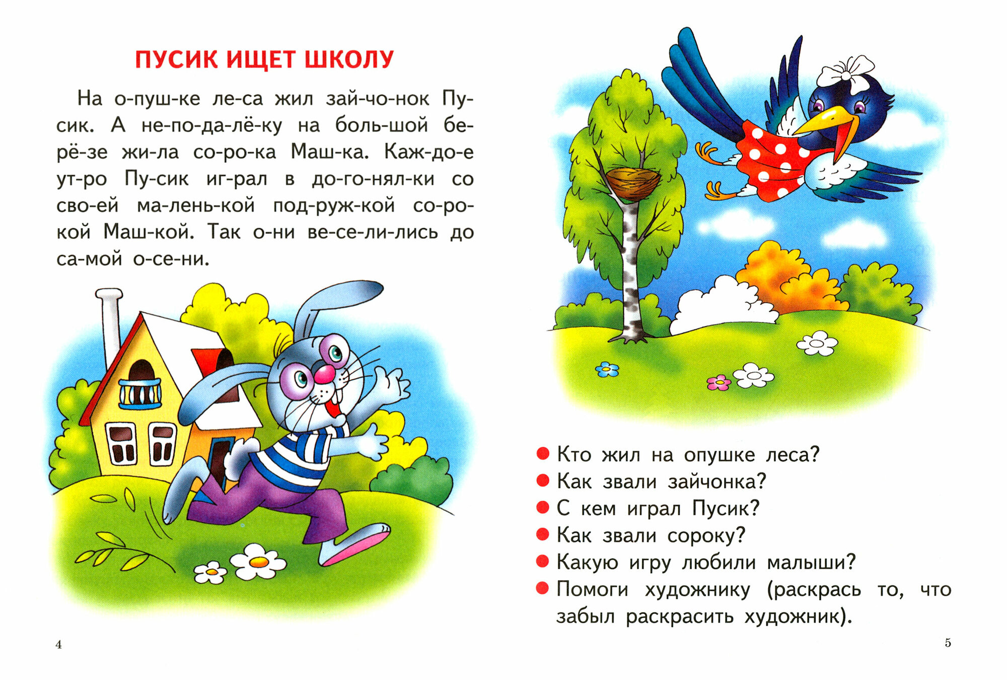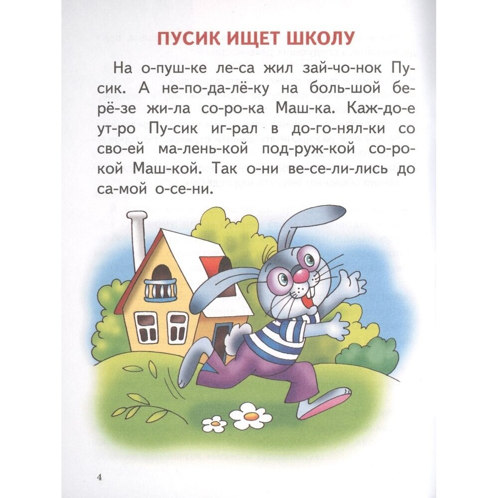 Отличная книга для ребенка, который учится читать! Два рассказа про зайчонка Пусика «Пусик ищет школу» и «Пусик научился читать». Текст первого рассказа разбит по слогам, во втором разбиты на слоги только сложные слова. Все рассказы разбиты на части(один разворот- это одна часть), после каждой части вопросы к тексту. Еще на каждом развороте задания до раскрашивать картинку. В конце встречаются задания найти подходящие слоги и слова, вписать имена зверей. На каждом развороте добрые и милые картинки. В рассказах звери пели песенку, я удивилась, что ребенку понравилось петь и он стремился быстрее от этого прочитать четверостишье. А в конце звери обращаются к ребенку, который читает текст и хвалят, что он тоже научился читать. Спасибо создателям за такую продуманную и недорогую серию книг!!!