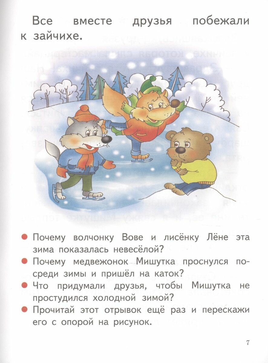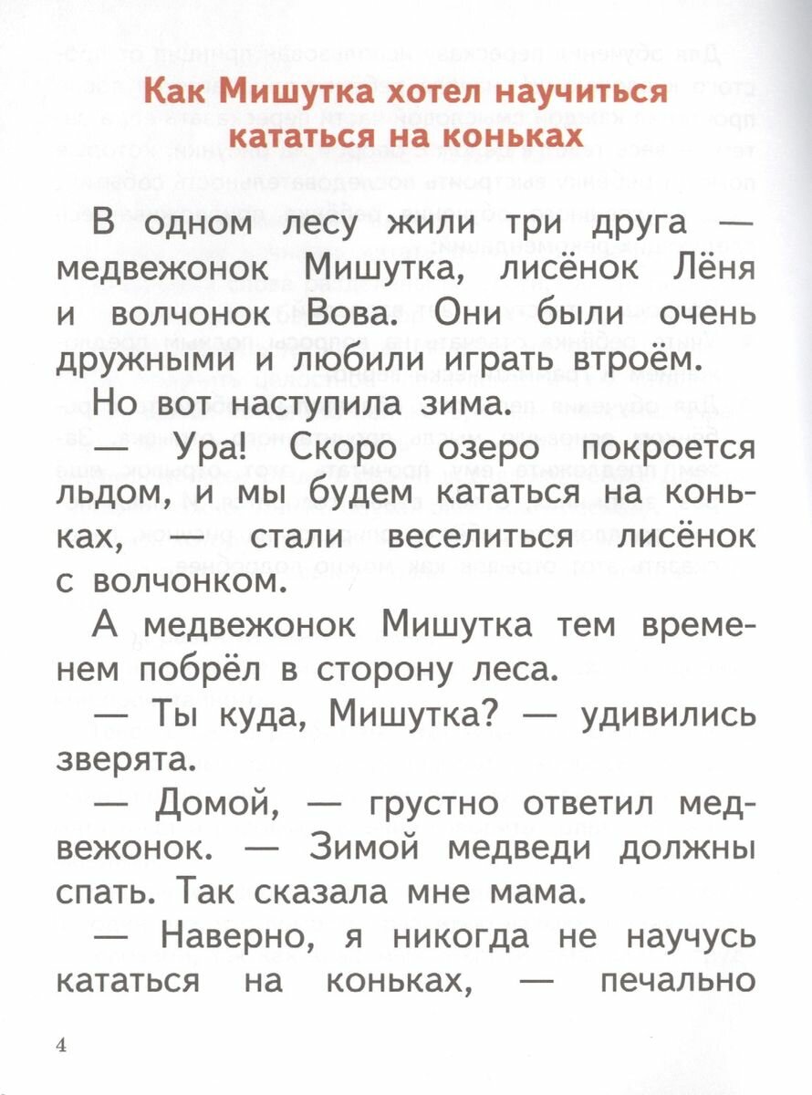 В книге 1 рассказ «Как Мишутка хотел научиться кататься на коньках». Рассказ разбит на главы ( всего 12 глав). Каждая глава помещается на разворот- текст главы на 1 стр, на второй странице картинка и вопросы к главе.