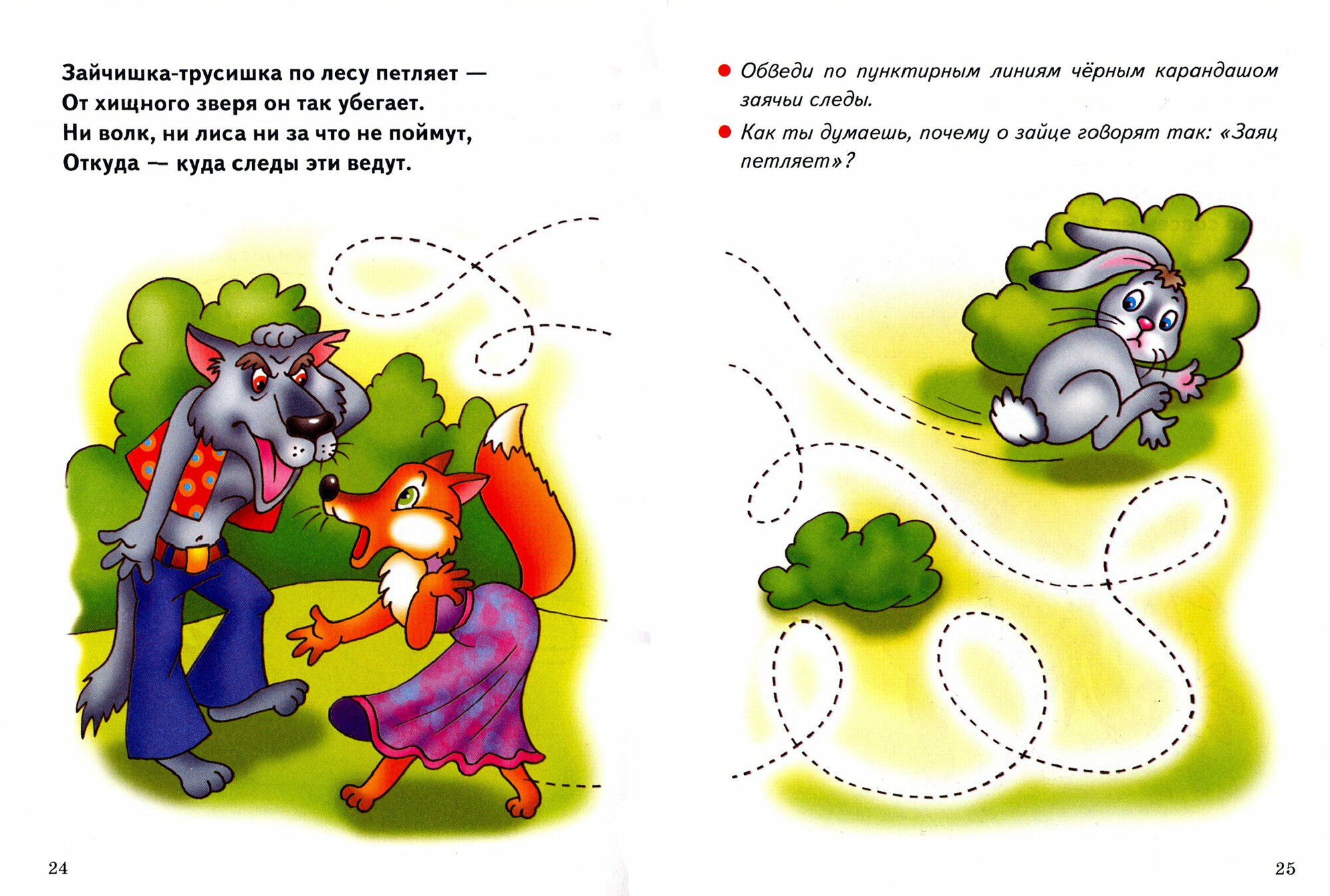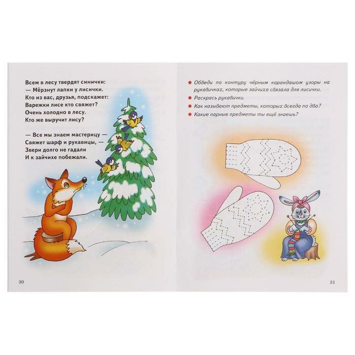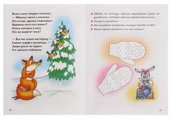 Всего где-то 25 картинок, которые нужно обвести по пунктирной линии. Есть простые контуры(дорожку нарисовать), есть сложные контуры(звездочки на варежках). Все же не все задания расположены в порядке усложнения контура. Задание идет на разворот. Слева к заданию стишок, на весь разворот цветная картинка, обвести по контуру и закрасить нужно всего один предмет(листик, солнышко, тучку). Еще есть вопросы, типа «какие ядовитые грибы ты знаешь?».