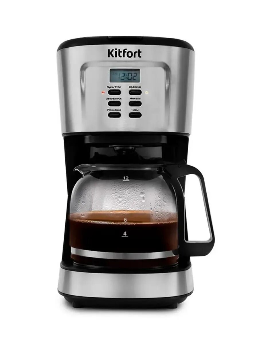 Kitfort Кофеварка Капельная кофеварка поможет приготовить ароматный кофе. В капельной кофеварке вода доводится до температуры 80–90 С, после чего медленно поступает в фильтр с молотым кофе. Пройдя через него, она попадает в кофейник. По окончании приготовления кофеварка перейдет в режим подогрева. Платформа с подогревом, на которой стоит кофейник с готовым кофе, будет горячей в течение 40 минут, затем кофеварка выключится. Кофеварка оборудована противокапельной системой — затвором, приостанавливающим подачу кофе при вынимании кофейника из кофеварки. Вы можете налить кофе в чашку, не дожидаясь окончания приготовления. Режим автозапуска позволит вам настроить автоматическое приготовление кофе к нужному часу без вашего участия. В установленное время кофеварка автоматически начнет приготовление, а вам останется только подойти и насладиться вкусным ароматным напитком. Резервуар емкостью 1,6 л позволяет за один раз приготовить кофе на 12 чашек емкостью 130 мл. Корпус кофейника прозрачный, поэтому вы всегда можете видеть, сколько кофе еще осталось. На задней части корпуса предусмотрен отсек для хранения шнура. Кофеварка предназначена для приготовления кофе в домашних условиях или в офисе. Особенности: капельное приготовление кофе режим автозапуск многоразовый нейлоновый фильтр электронное управление автоотключение система капля-стоп режим Крепкий кофе Размер: 23 х 18,2 х 34 см