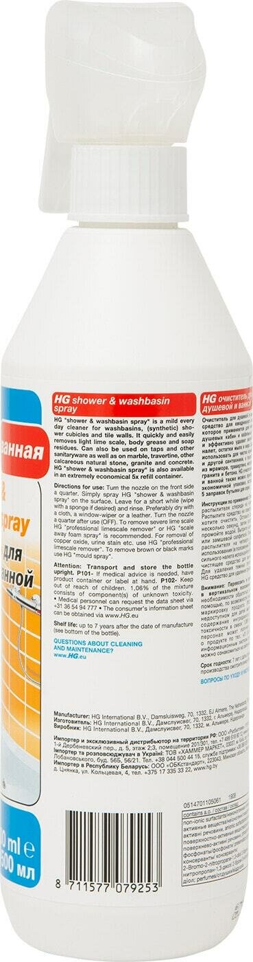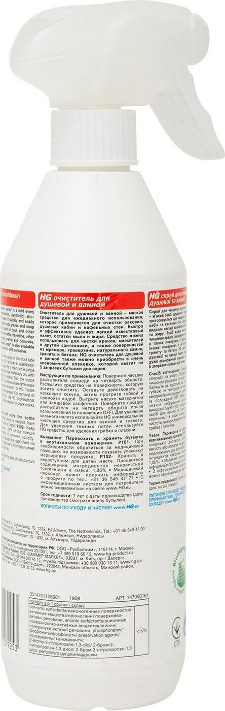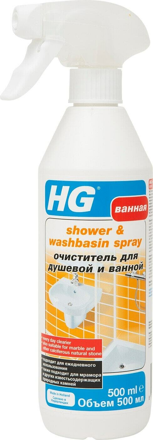 Очиститель для душевой и ванной HG . Объем 0,5л. Подходит для любых поверхностей, в том числе для натурального камня. Действует быстро и эффективно.
