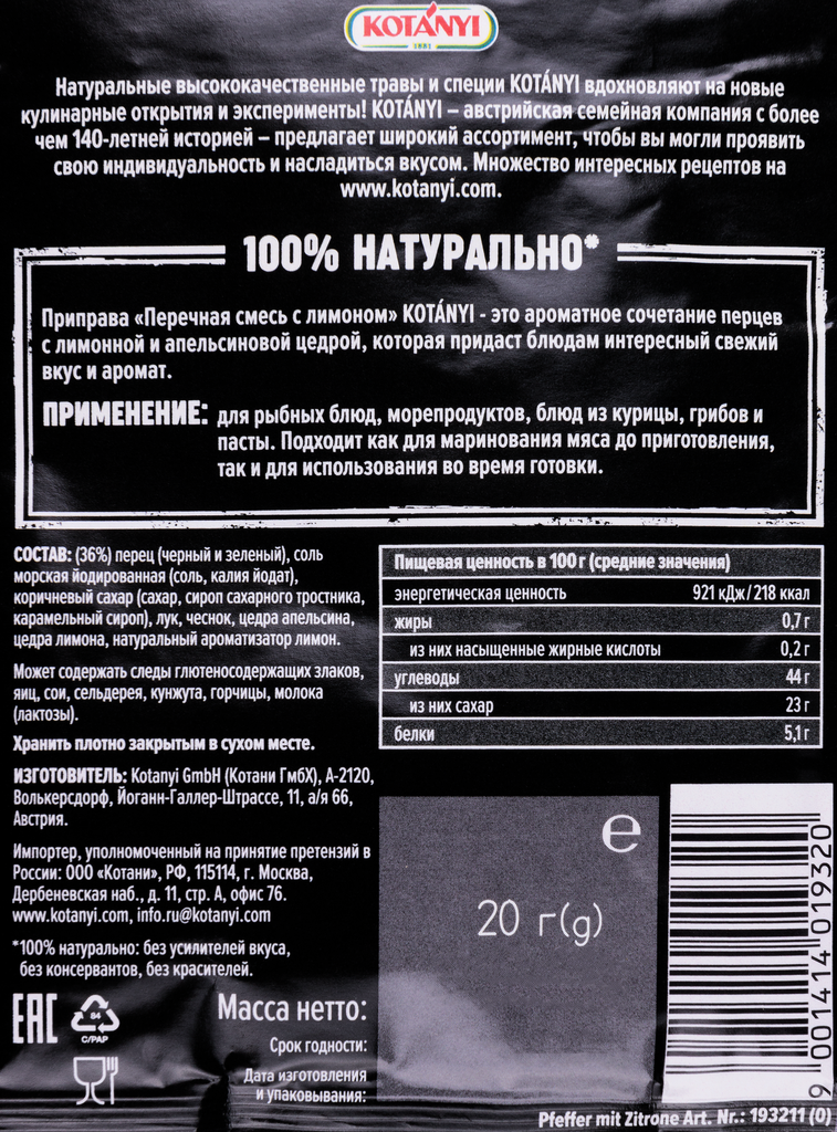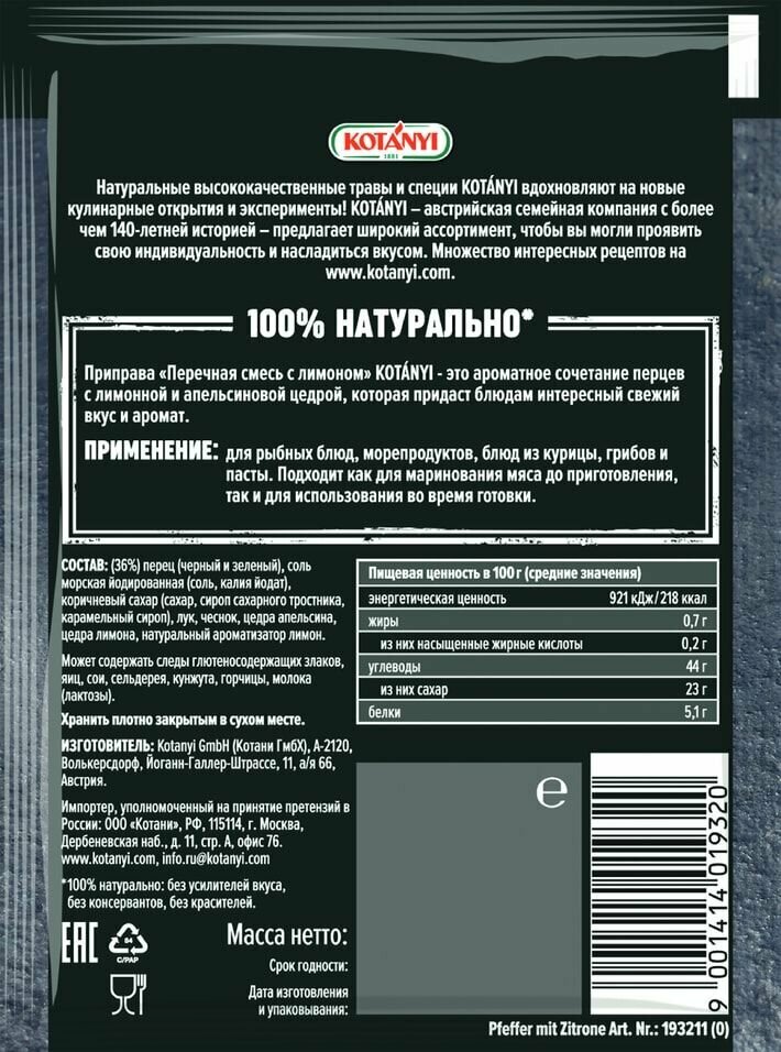 | Состав | Перец (черный и зеленый), соль морская йодированная (соль морская, калия йодат), коричневый сахар (сахар, сироп сахарного тросника, карамельный сахарный сироп), лук, чеснок, цедра апельсина, цедра лимона, натуральный ароматизатор лимон. |