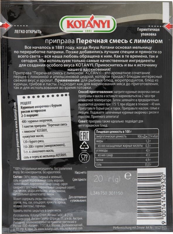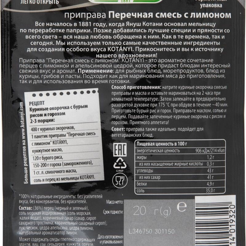 Описание товара:Приправа "Перечная смесь c лимоном" Kotanyi - это ароматное сочетание перцев с лимонной и апельсиновой цедрой, которая придаст блюдам интересный свежий вкус и аромат.Состав товара:(36%) перец (черный и зеленый), соль морская йодированная (соль, калия йодат), коричневый сахар (сахар, сироп сахарного тростника, карамельный сахарный сироп), лук, чеснок, цедра апельсина, цедра лимона, натуральный ароматизатор лимон.Способ приготовления:Рецепт: Куриные окорочка с бурым рисом и горохом 2-3 порции: 400 г куриных окорочков, 1 пакетик приправы "Перечная смесь с лимоном" Kotanyi, кунжутное масло, 120 г бурого риса, 150-200 г гороха (замороженного), 1 ст.л. сливочного масла, соль и перец из мельницы Kotanyi. Натрите куриные окорочка смесью приправы и масла и оставьте мариноваться на 2 часа при комнатной температуре. Затем запекайте в предварительно разогретой духовке при 175 °С при обдуве в течение ~40 мин. Приготовьте бурый рис и горох. Приправьте маслом, солью и перцем. Подавайте запеченные куриные окорочка с рисом и горохом. Приятного аппетита! Совет: приправа также идеально подойдет для вегетарианских блюд.Меры предосторожности:Может содержать следы глютеносодержащих злаков, яиц, сои, сельдерея, кунжута, орехов, молока (лактозы). Хранить плотно закрытым в сухом месте.