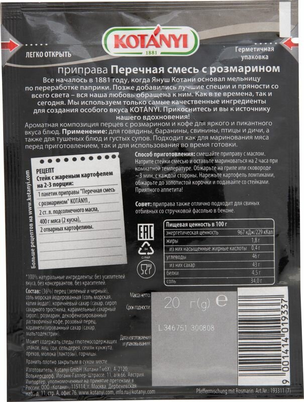 Описание товара:Ароматная композиция перцев с розмарином и кофе для яркого и пикантного вкуса ваших блюд.Состав товара:(36%) перец (зеленый и черный), соль морская йодированная (соль морская, калия йодат), коричневый сахар (сахар, сироп сахарного тростника, карамельный сахарный сироп), розмарин, декофенизированный растворимый кофе, розовый перец, карамелизированный сахар (сахар, мальтодекстрин).Способ приготовления:Рецепт: Стейк с жареным картофелем на 2-3 порции: 1 пакетик приправы "Перечная смесь с розмарином" Kotanyi, 2 ст.л. подсолнечного масла, 400 г мяса (2 куска), 2 отварных картофелины. Смешайте приправу с маслом. Натрите стейки смесью и оставьте мариноваться на 2 часа при комнатной температуре. Обжарьте на гриле или сковороде мин. с каждой стороны. Нарежьте картофель ломтиками, обжарьте до золотистой корочки и подавайте со стейками. Приятного аппетита! Совет: приправа также отлично подходит для свиных отбивных со стручковой фасолью в беконе.Меры предосторожности:Может содержать следы глютеносодержащих злаков, яиц, сои, сельдерея, кунжута, орехов, молока (лактозы). Хранить плотно закрытым в сухом месте.