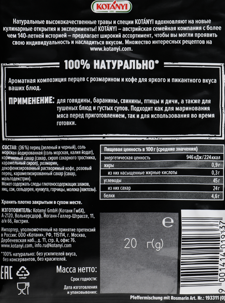 | Состав | Перец (черный и зеленый), соль морская йодированная (соль морская, калия йодат), коричневый сахар (сахар, сироп сахарного тросника, карамельный сахарный сироп), розмарин, декофенизированный растворимый кофе, розовый перец, карамелизированный сахар (сахар, мальтодекстрин). |