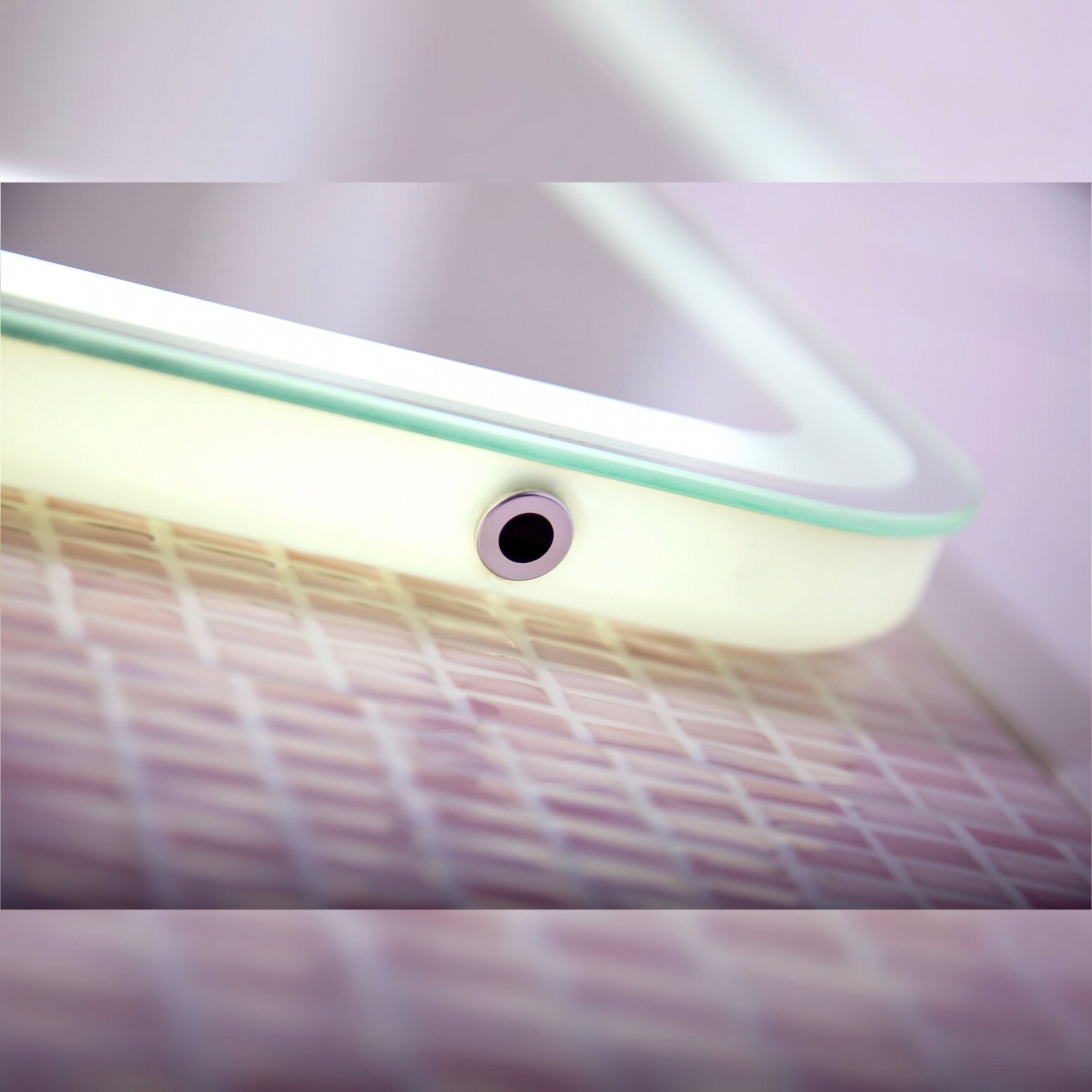 Большое зеркальное полотно с подсветкой, на взмах руки, навески для крепления к стене. Светодиодная подсветка, трансформатор для светодиодных светильников, электрический провод 0.5 м для подключения к электросети 220В.