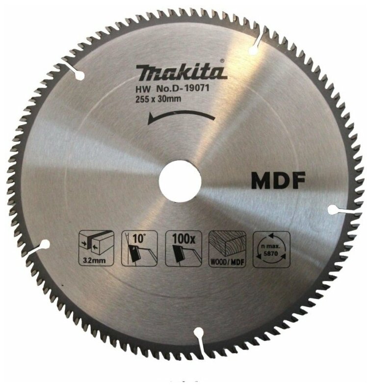Пильный диск Makita 255х30/15.88х3.2х100T (). Диаметр 254 мм, посадочное отверстие 30/15.88 мм, 100 зубов. Толщина реза 3.2мм. Диск пильный по древесине и ламинату (МДФ (MDF) и ДВП) Makita Specialized 255х30х2.4/100 является универсальным диском для чистого реза дерева и древесно-волокнистых плит (ДВП, МДФ) различной плотности с помощью циркулярных пил (в том числе торцовочных и погружных).Технические характеристикиТолщина диска, мм 3.2 Число зубьев 100Диаметр, мм 254 Посадочное отверстие, мм 30 / 15.88КомплектацияПильный диск 1 шт