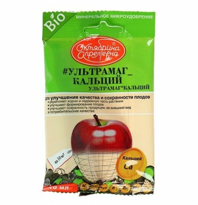 Удобрение Ультрамаг Кальций широко применяется для улучшения качества и сохранности плодов. Быстро усваивается растением через листья, восполняя недостающее количество кальция, а также предотвращает дефицит магния и бора.
